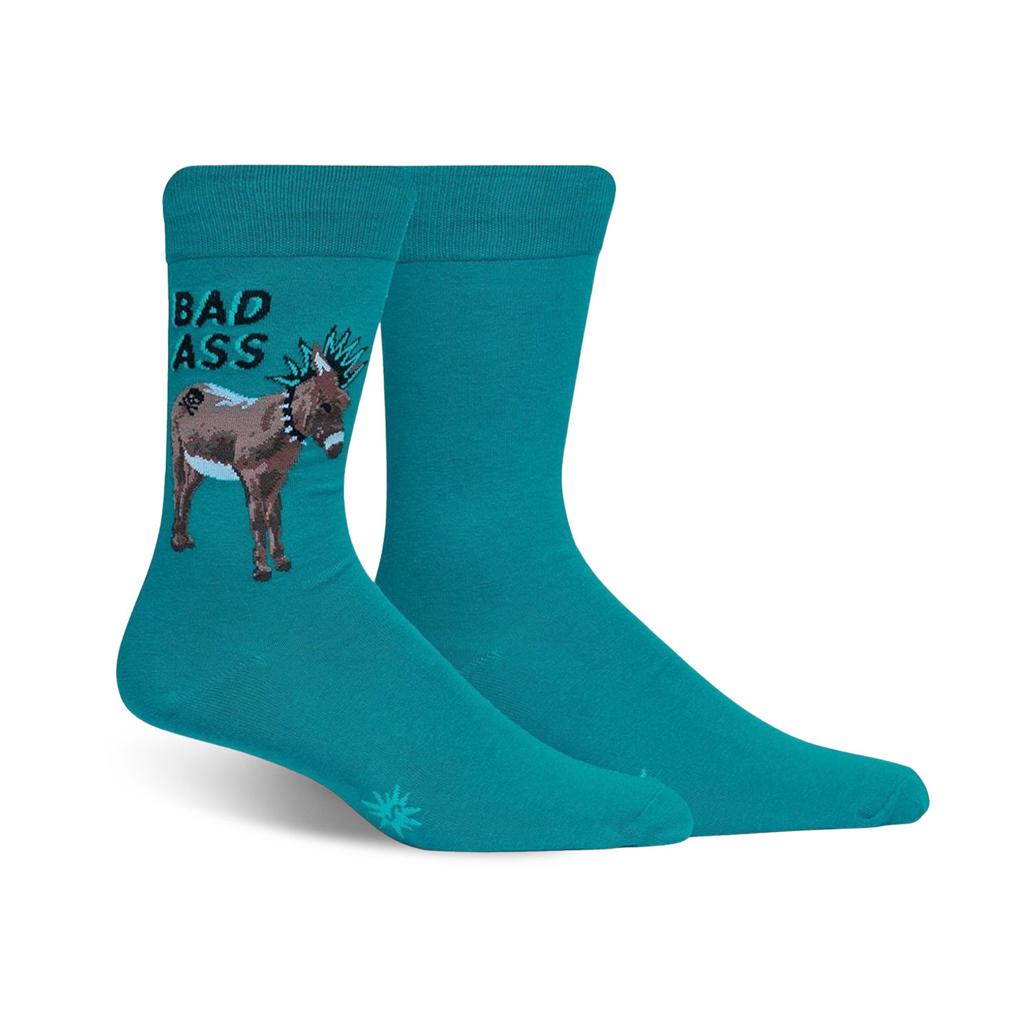 Talk about a real bad ass! These royal teal crew socks for men feature a kicking cool pattern of a donkey wearing a spiked collar and the words "Bad Ass" above its head in bold white lettering. Show off your love of these stubborn but noble creatures and take these socks for a ride the next time you need to channel your inner beast. Warning: These socks may make you feel so bad ass that you start kicking down doors and demanding a steak dinner.