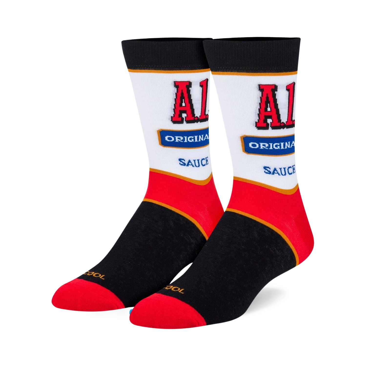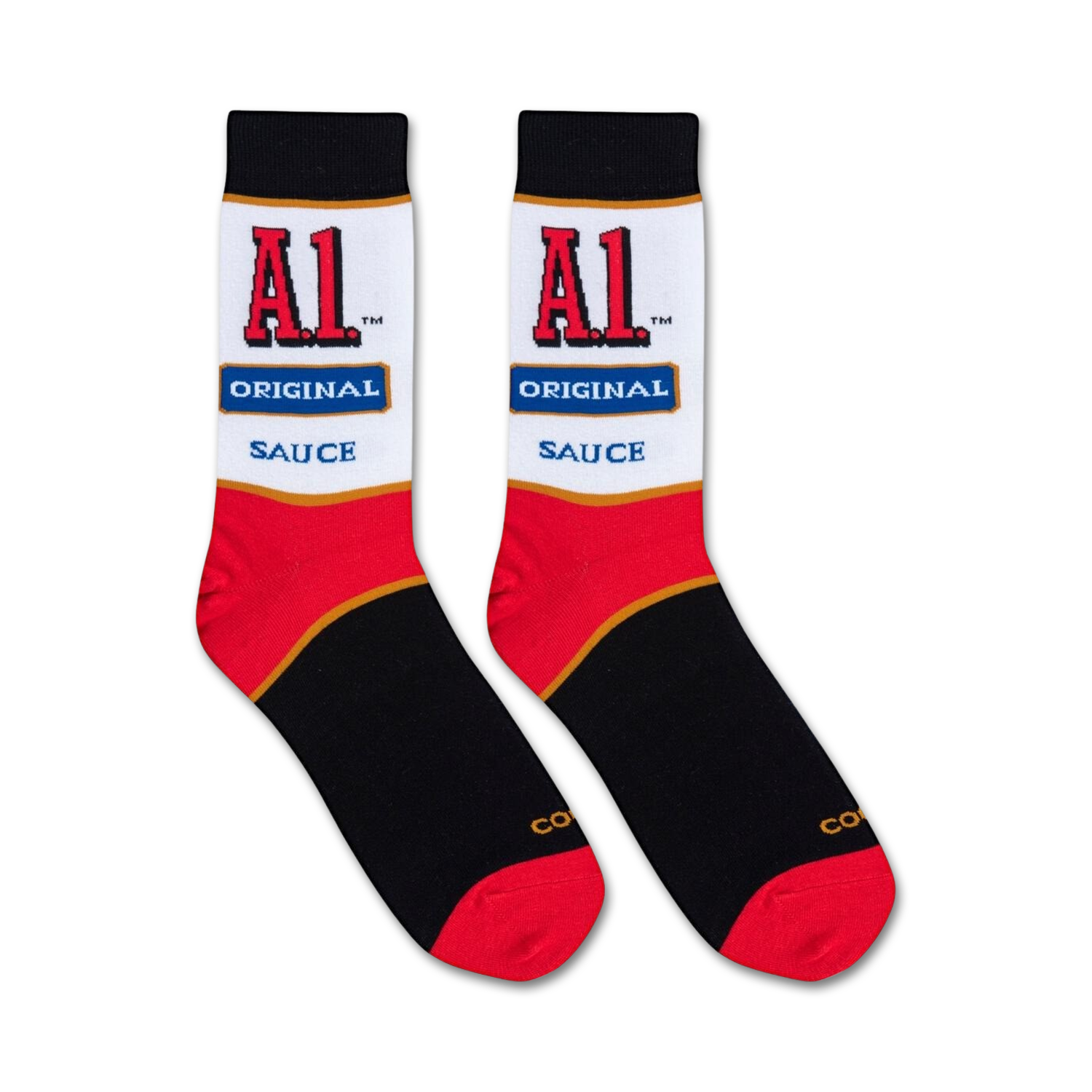 These A1 Steak Sauce socks are sure to be your new favorite! Get saucy with this stylish and condiment-inspired design featuring red and white stripes at the toe and heel, bold black accents, and the iconic A1 Original Sauce logo on a white background. Add some flavor to your feet and show the world you're as unique as the steak sauce you put on your plate.