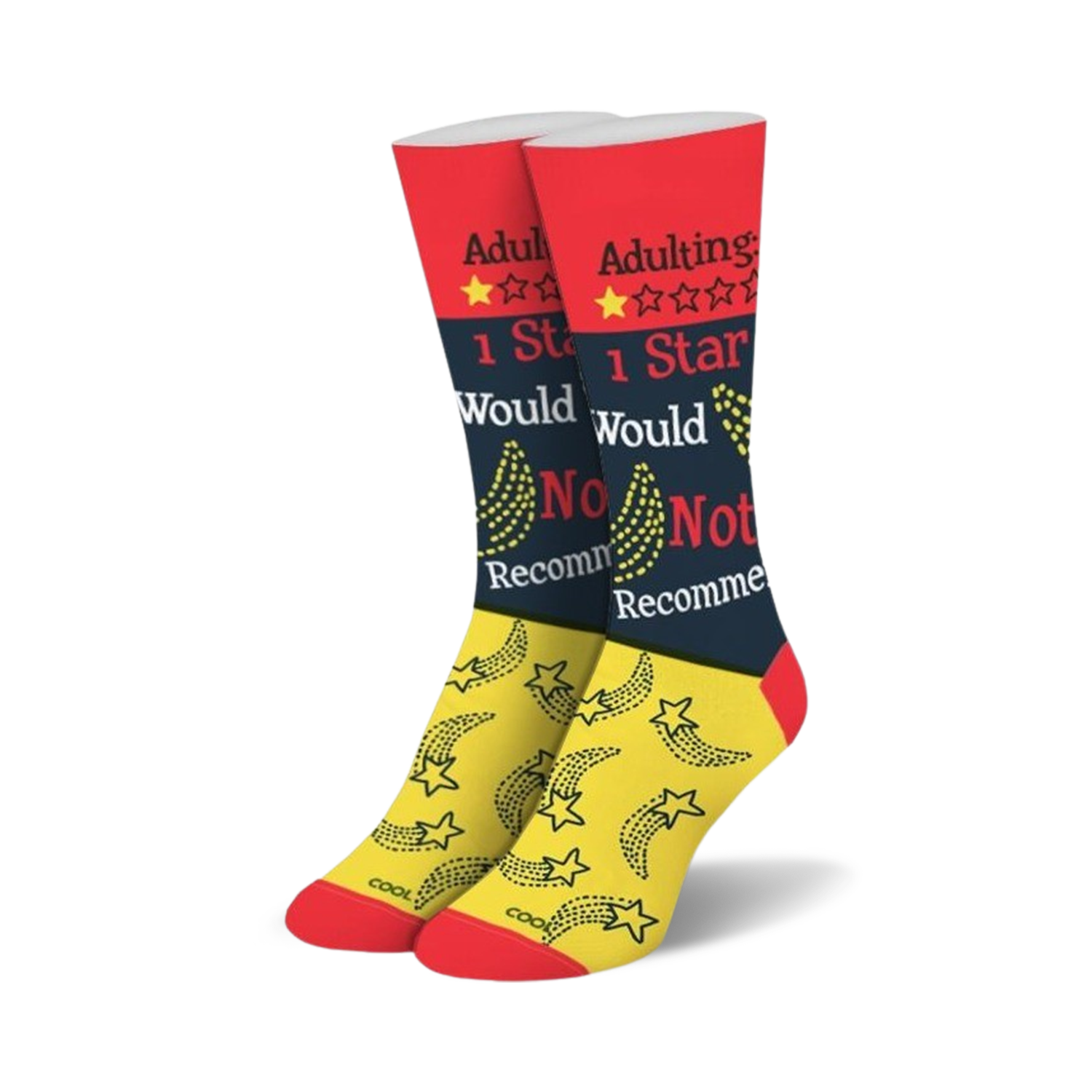 Wrap your ankles in a bold declaration of rebellion against the humdrum of adulthood! These red and black crew socks, speckled with defiant yellow stars, sport the ultimate cheeky review: "Adulting: 1 Star, Would Not Recommend". Perfect for those days when you're not here for adult responsibilities and your feet speak your mood.