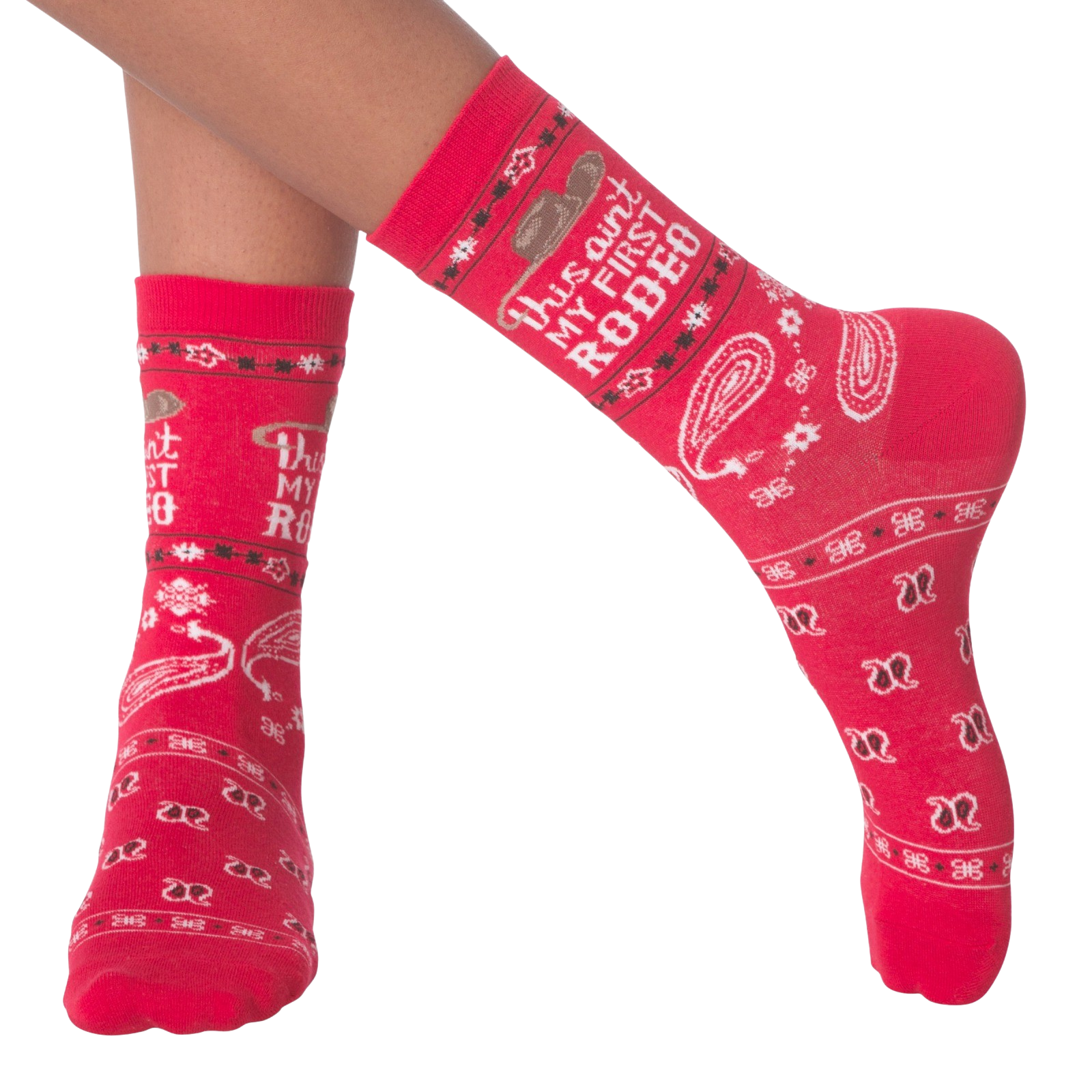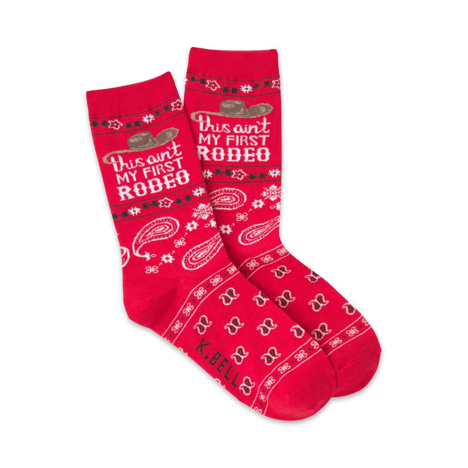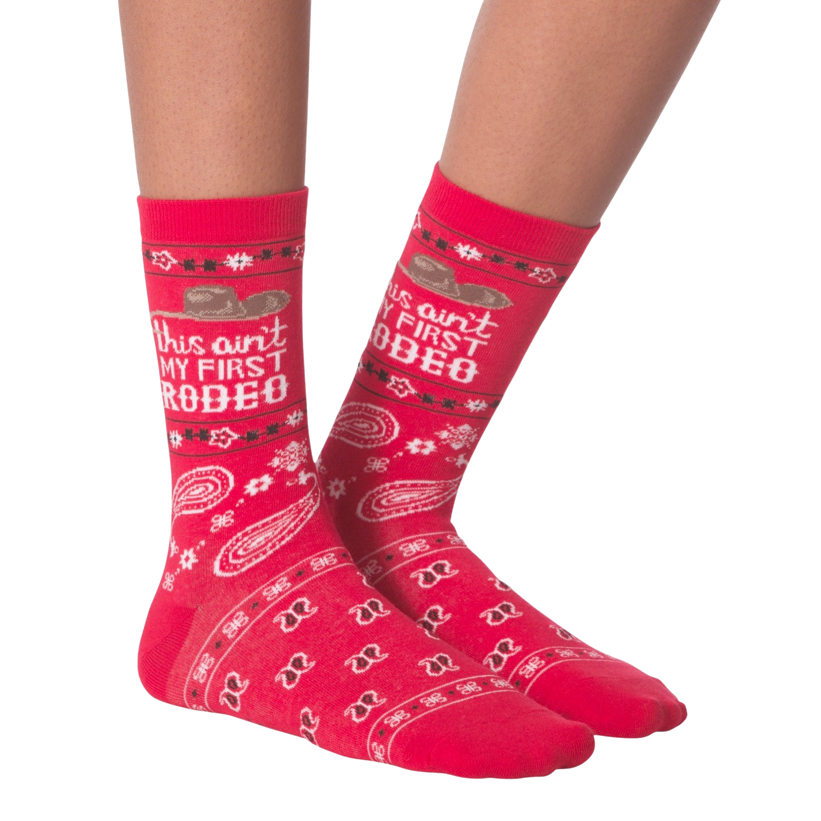 Howdy, fashion fanatics! Presenting the 'Ain't My First Rodeo' socks a boot-scootin', knee-slappin' addition to your sock collection. These fiery red socks dazzle with a pattern of white cowboy hats and paisley designs, sure to make you the talk of the town. And get this they've got the phrase 'This Ain't My First Rodeo' boldly displayed, serving as a reminder that you're a seasoned pro in the game of life. Giddy up and add these socks to your wardrobe for a rootin'-tootin' good time!