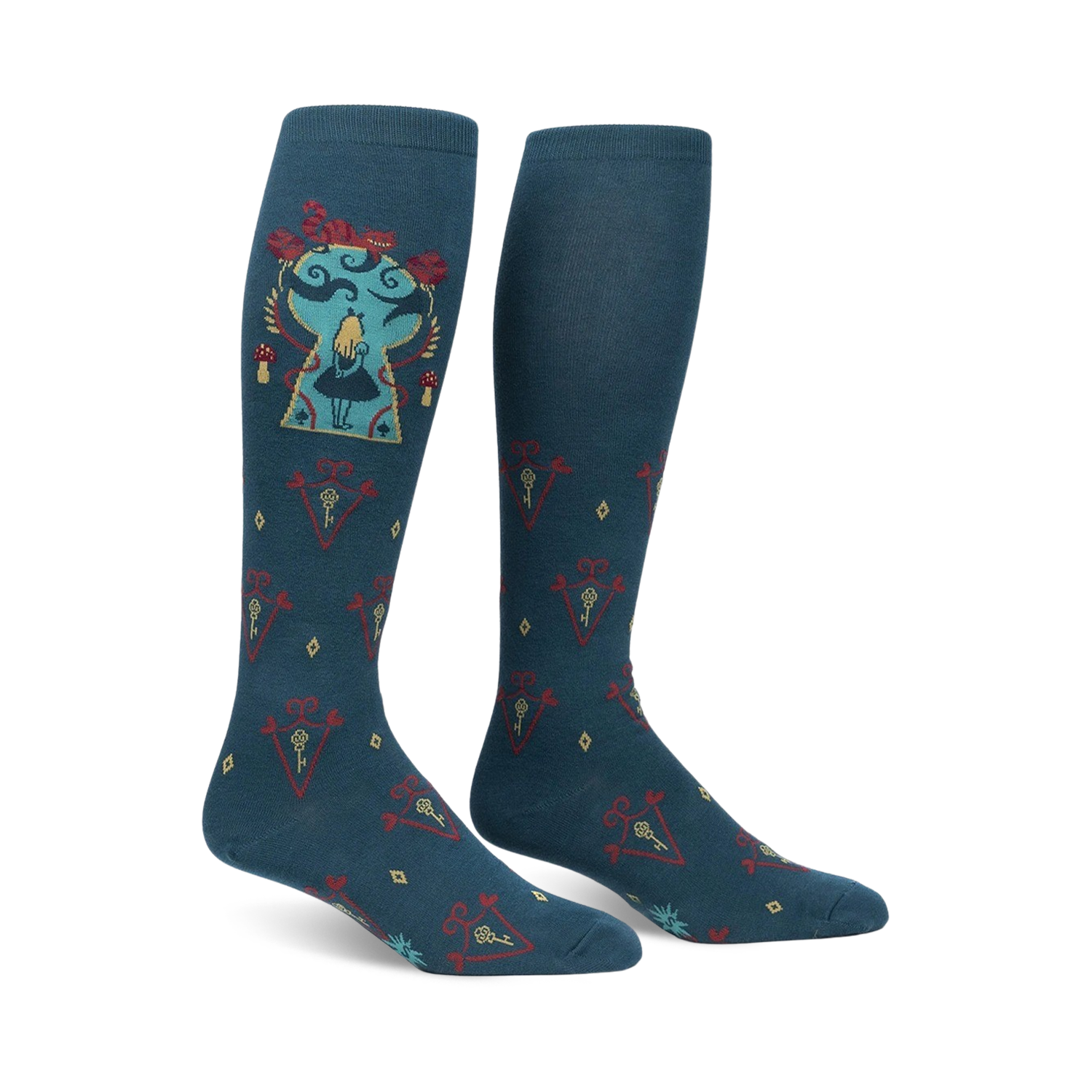 Fall down the rabbit hole with our Alice in Wonderland knee socks! Featuring a vibrant pattern of gold keys and diamonds on a dark teal backdrop, these socks are as captivating as a Cheshire cat's grin. Each sock boasts a regal portrait of Alice, inviting you to explore the fantastical world of Wonderland. Prepare to have grinning feet!