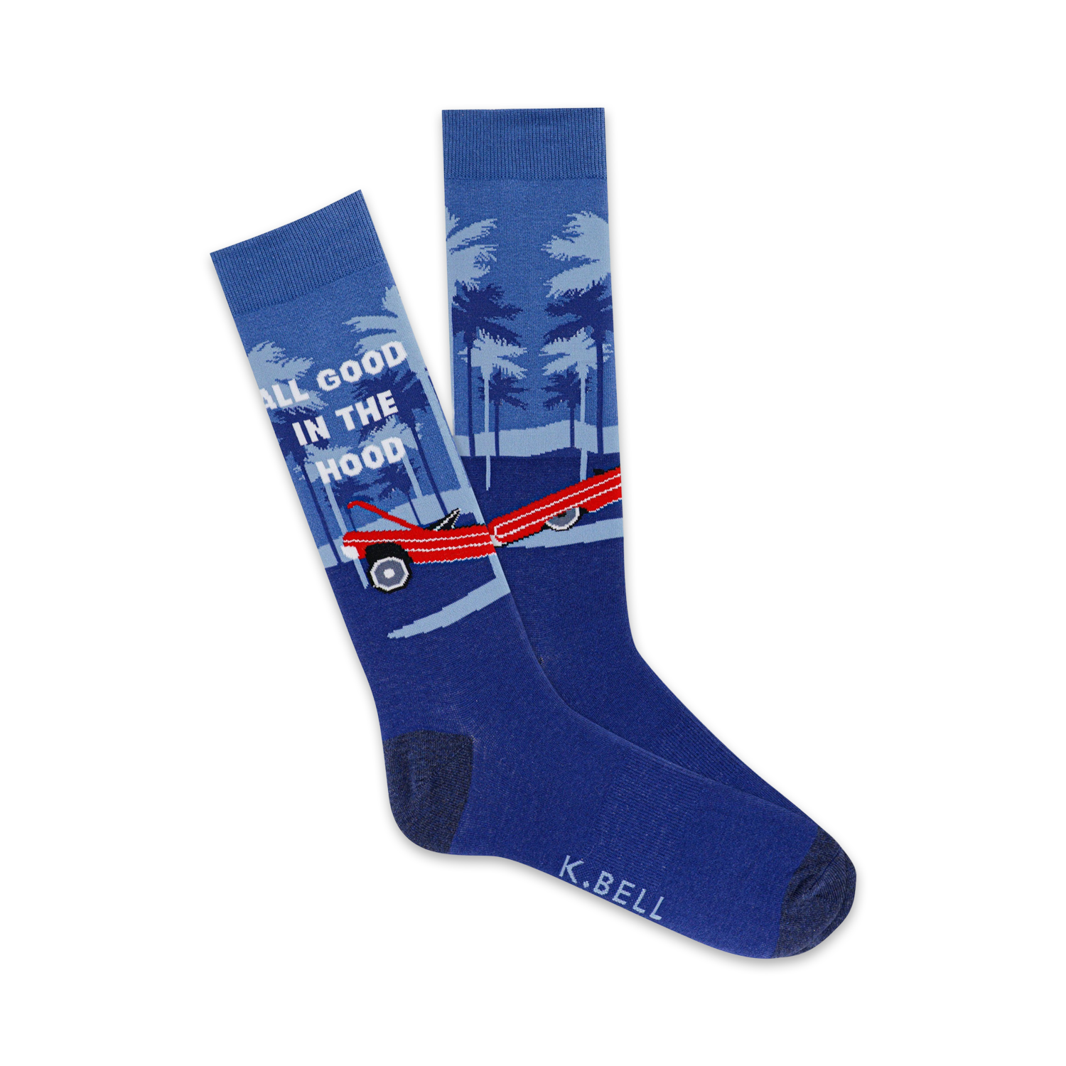 Cruise into comfort with these men’s blue crew socks, where chill vibes meet street style. Featuring a slick red lowrider, iconic palm trees swaying in the breeze, and the laid-back affirmation “All Good In The Hood” text, they’re a nod to those endless summer days and cool urban nights. Pull these on and keep the easygoing spirit of the neighborhood alive, right down to your toes.