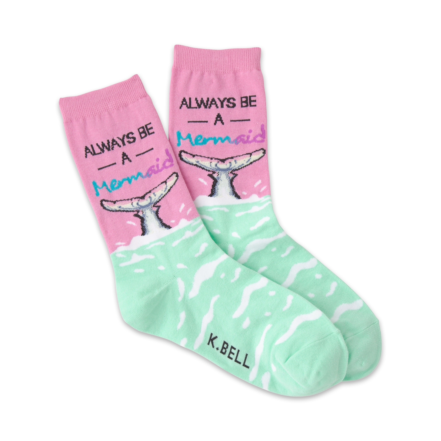 Why be an every day gal when you can be a mermaid? If the option ever presents itself, you know what to do! These fun socks will have you living for the sea life. Each cute pair of green and pink crew socks features ocean waves and a mermaid tail. Below the cuff reads "Always be a mermaid".