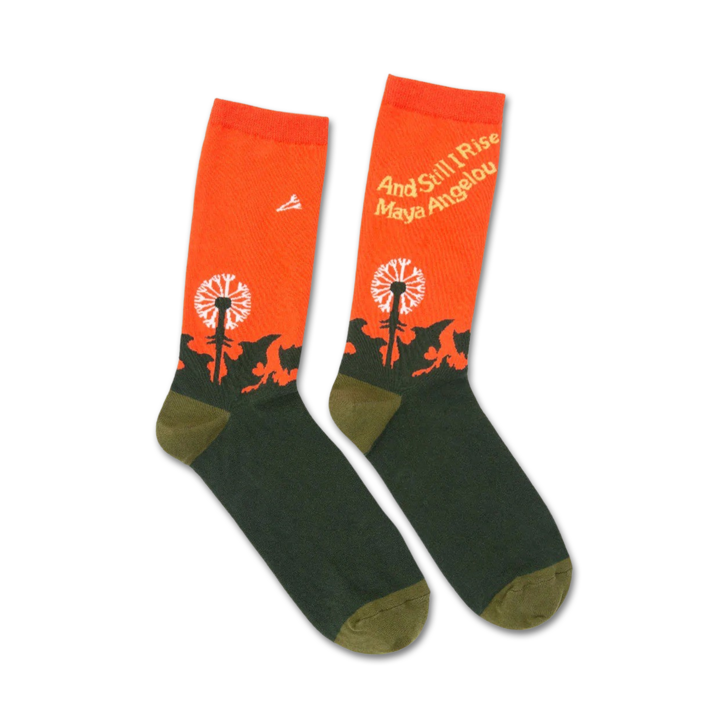 And Still I Rise Crew Socks: These dazzling orange and green crew socks will uplift your spirits and remind you of the strength and resilience within you. Adorned with a quote from the legendary Maya Angelou, "And Still I Rise," and featuring a delicate dandelion graphic, these socks are more than just a fashion statement; they're a celebration of life. Step into these socks and feel empowered, inspired, and ready to conquer any challenge that comes your way. With their vibrant colors and inspirational message, these And Still I Rise socks are the perfect reminder that even in the face of adversity, we can rise above and bloom beautifully.