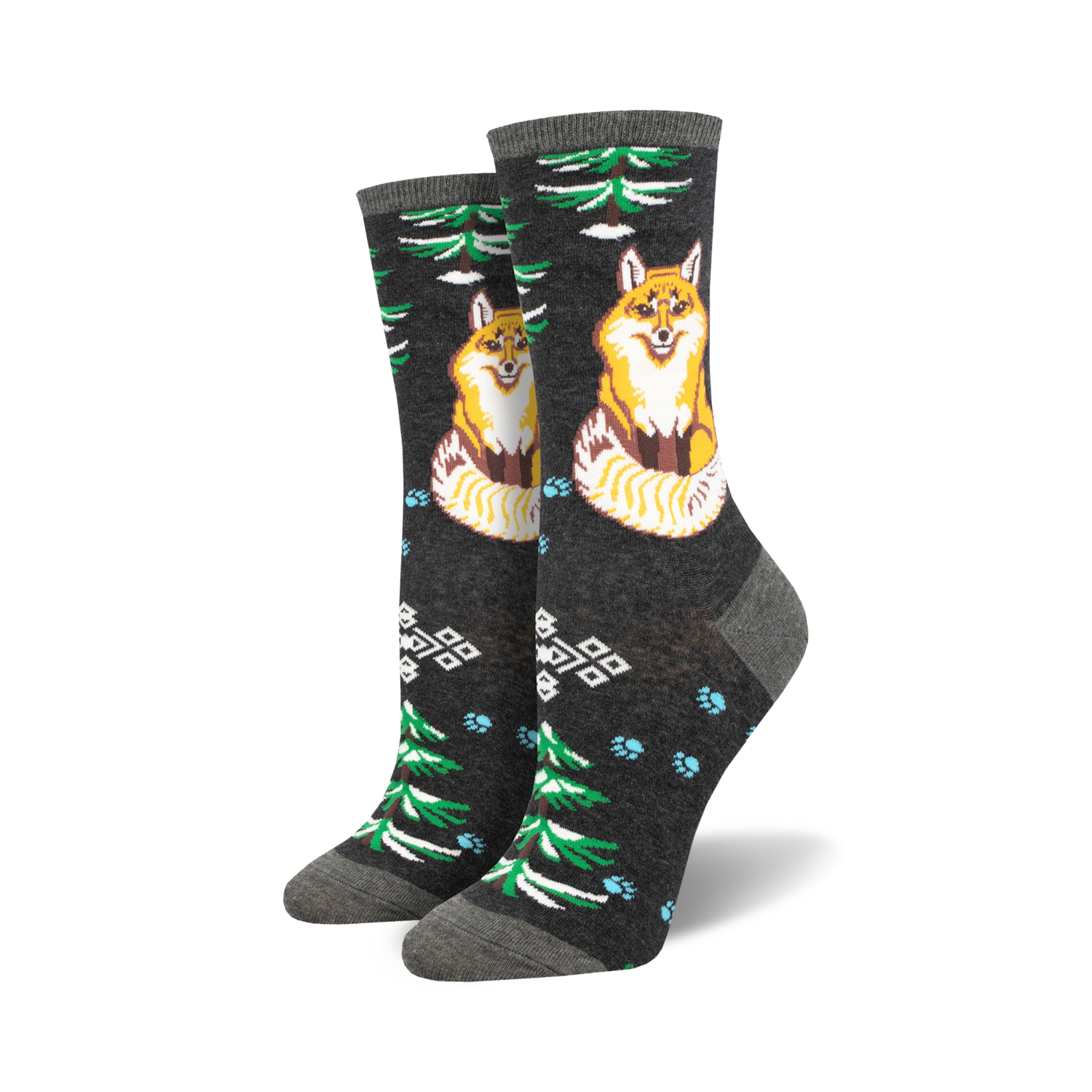 Designed for the discreet adventurer, these dark gray crew socks feature an enchanting tableau of green pine trees, cheery red mushrooms, and a cunning fox nestled in a snowy landscape. It's like having a secret forest party under your trousers! Perfect for those who carry the spirit of the woods in their stride—without having to forage through the underbrush. Ideal for tree huggers, mushroom foragers, and fox admirers alike, these socks are your ticket to a world where style meets the subtlety of nature. Don't just wear them; let them tell your story with every step.