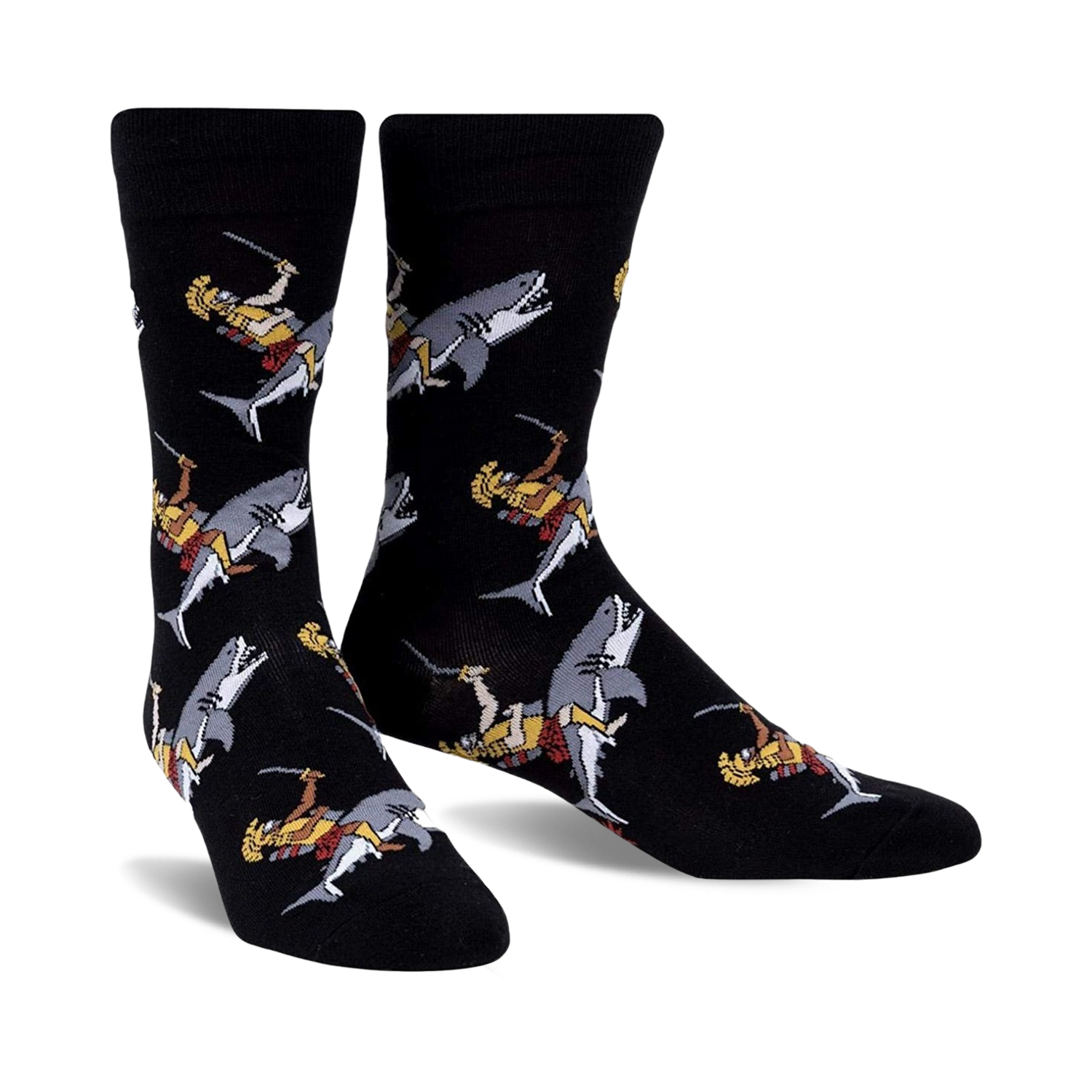 Are You Not Entertained? asks the cartoon gladiator as he battles a shark on these men's crew socks. Take a bite out of boring feet with this action-packed pair. Slip these jawsome socks on and become a champion of sock-dom. Feel the power with every step.