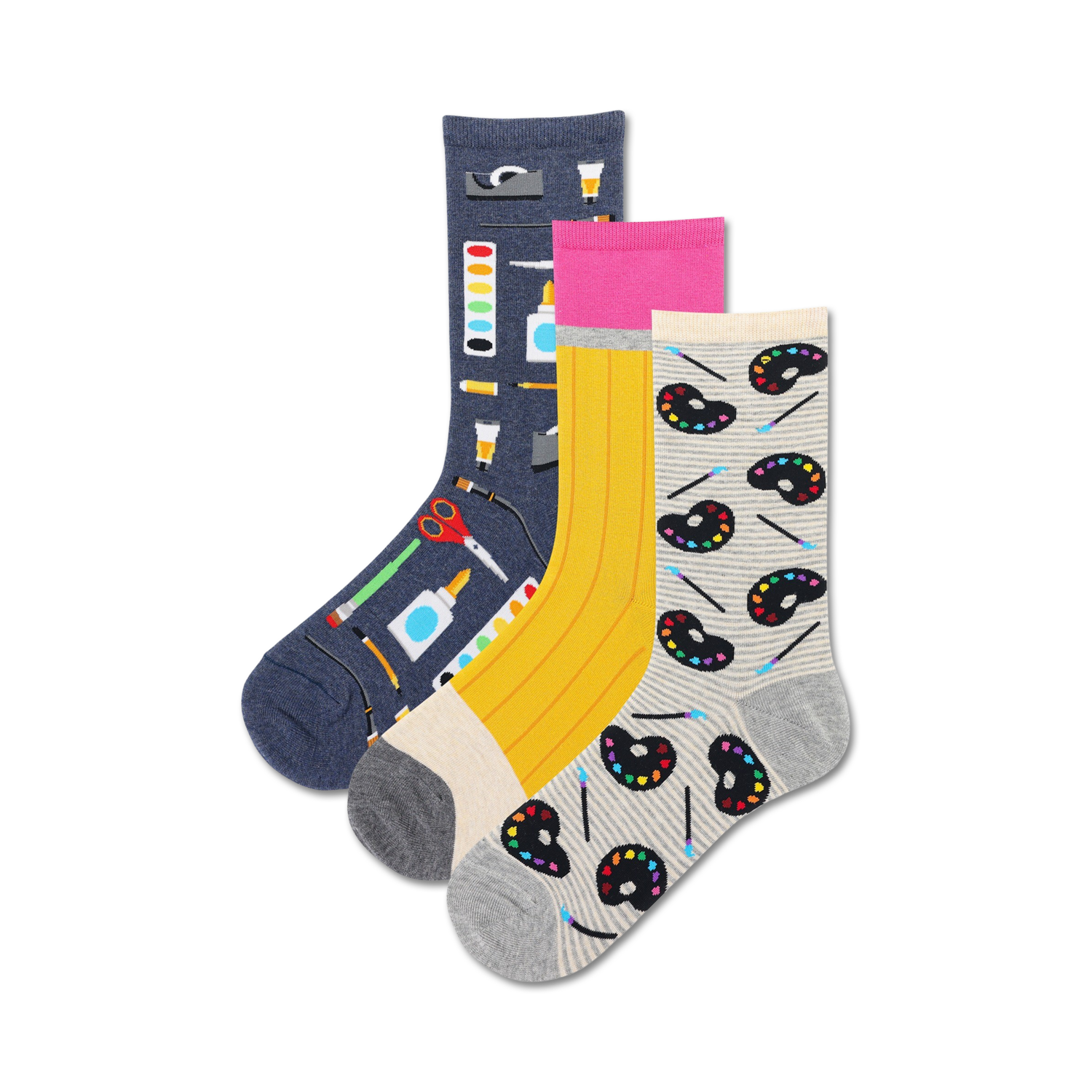 Calling all art enthusiasts! Add a pop of creativity to your everyday style with our Artist Palettes Women's 3 Pack Crew Socks. Featuring a colorful array of paint palettes, paintbrushes, scissors, glue, tape, and pencils, these socks will bring a smile to your face and inspire your inner artist. Made from a soft and comfortable cotton blend, these socks are perfect for expressing your passion for art wherever you go. Unleash your colorful spirit and let your socks do the talking!