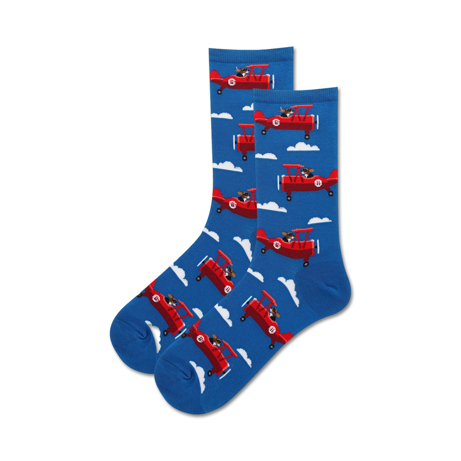 Soar through your day with whimsy at your feet! Introducing our "Flying High" socks, where the sky's the limit. Adorned with fluffy white clouds, these blue crew socks feature a daring dog piloting a propeller plane, bringing a touch of adventurous spirit right to your toes. Perfect for the daydreamer who's always had their head in the clouds — now you can wear your daydreams too! Whether you're running errands or just lounging at home, let your feet take flight in style and comfort. Dive into the blue and let every step unleash a little more joy into your world. Because why walk when you can fly?