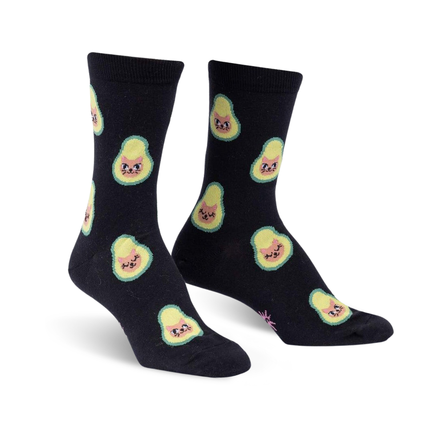 Avocados and cats: the best of both worlds! Avocato socks feature an irresistibly cute pattern of avocadoes, each with a mischievous cat face, on a vibrant black background. These fun and playful socks are made for those who love a good pun and want to add a touch of whimsy to their everyday wardrobe. Whether you wear them to a casual get-together, a day at the office, or even just lounging around at home, these socks are sure to bring a smile to your face and those around you.
