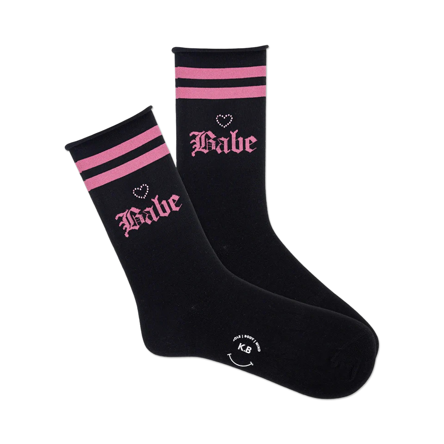 Strut your stuff with our "Babe Roll Top" socks. Express your sassy side with these black and pink, crew length, statement socks. Join the club of cool cats who rock their sassy style with a touch of fun. Ready to add more pep to your step? These socks are just the ticket!