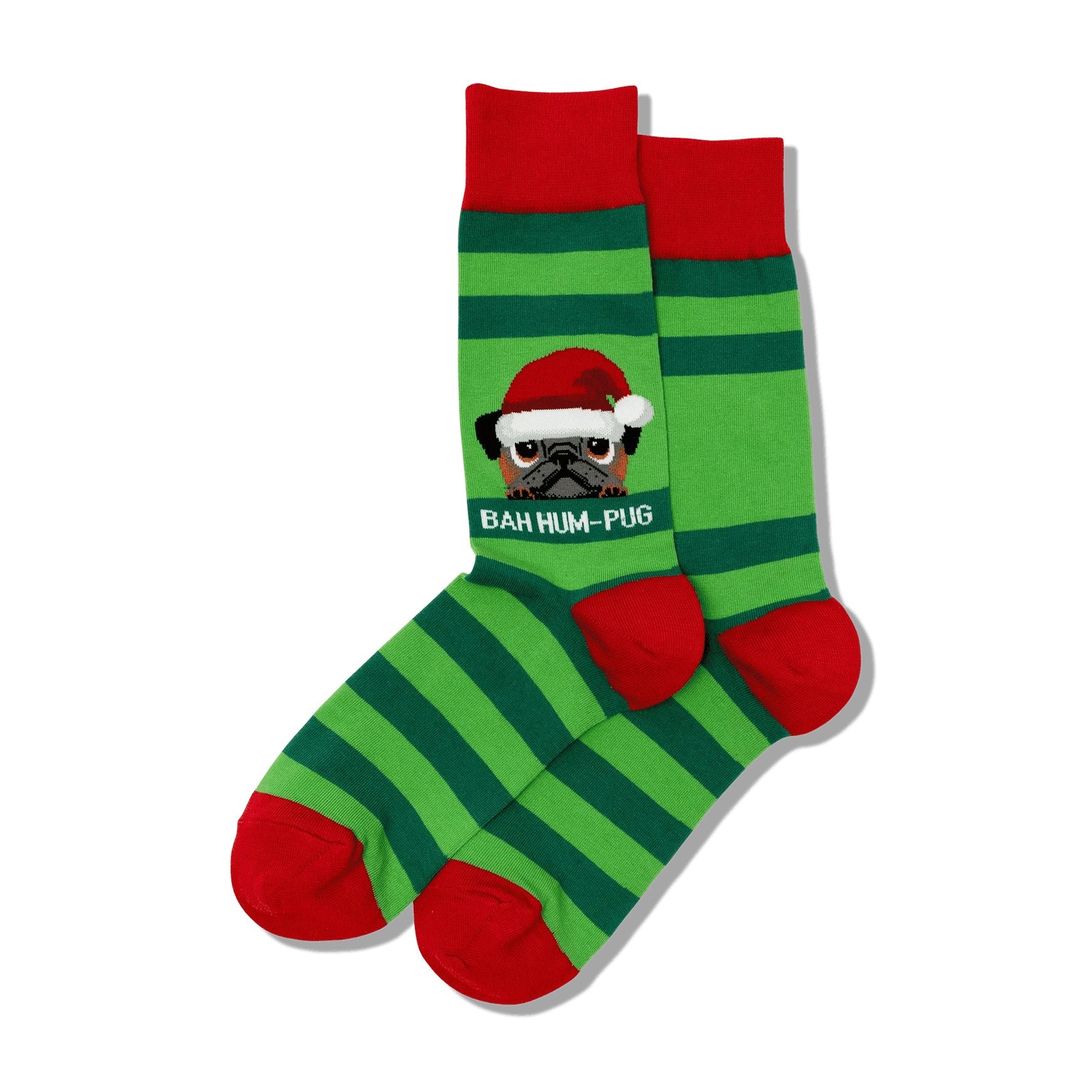 Deck the halls with boughs of holly...and these Bah Hum-Pug socks! They're crew socks with green and red horizontal stripes. A pug wearing a Santa hat is shown on the sock, with the phrase 'Bah Hum-Pug' underneath. The visible portion of the cuff is red. Perfect for the holidays or anyone who loves pugs.