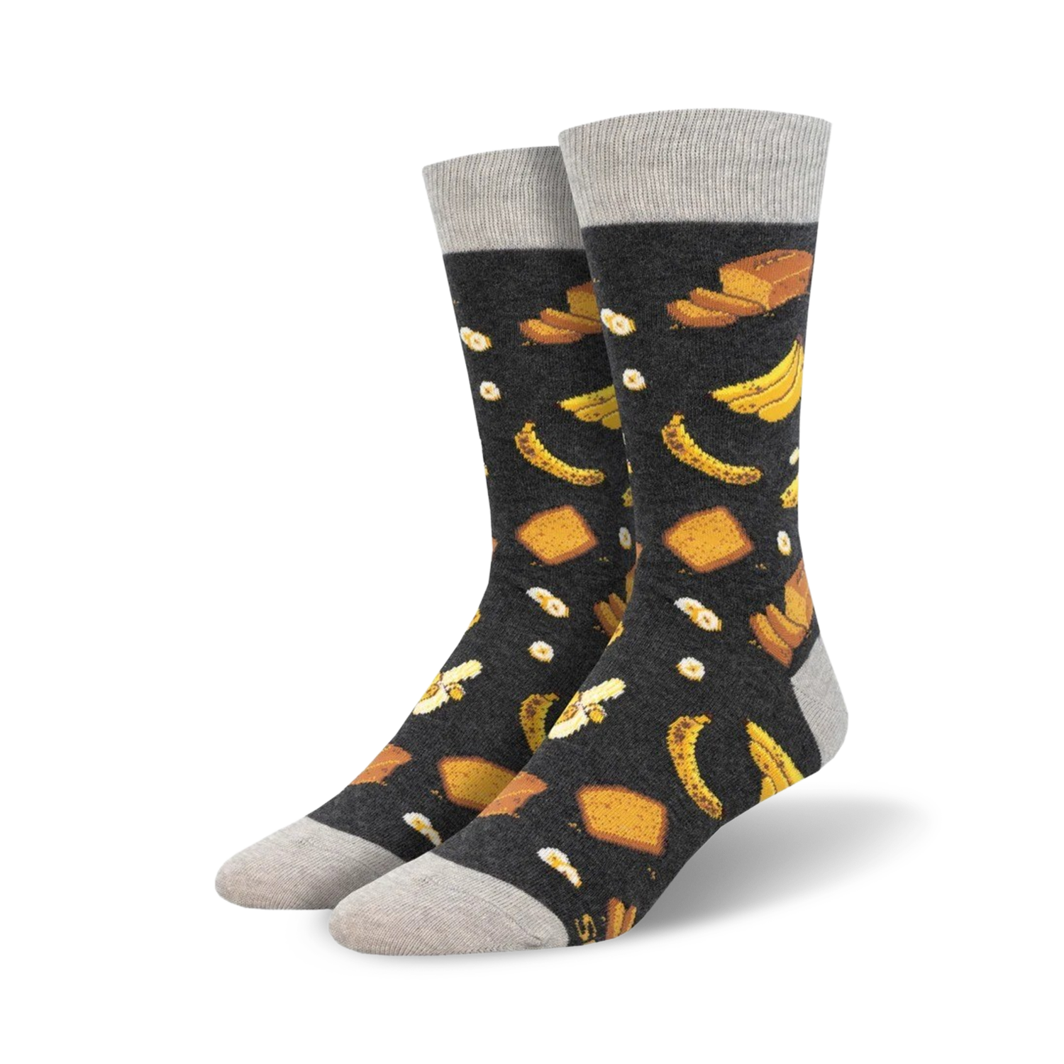 Bold, bright, and bursting with flavor - just like your favorite breakfast! These Banana Bread socks feature bananas, bread slices, and fried eggs on a dark background. The pattern is the same on both socks - because nothing says "I'm ready for breakfast" like matching socks! Whether you're scrambling to get out the door or just lounging around, these socks will add a bit of fun and whimsy to your day.