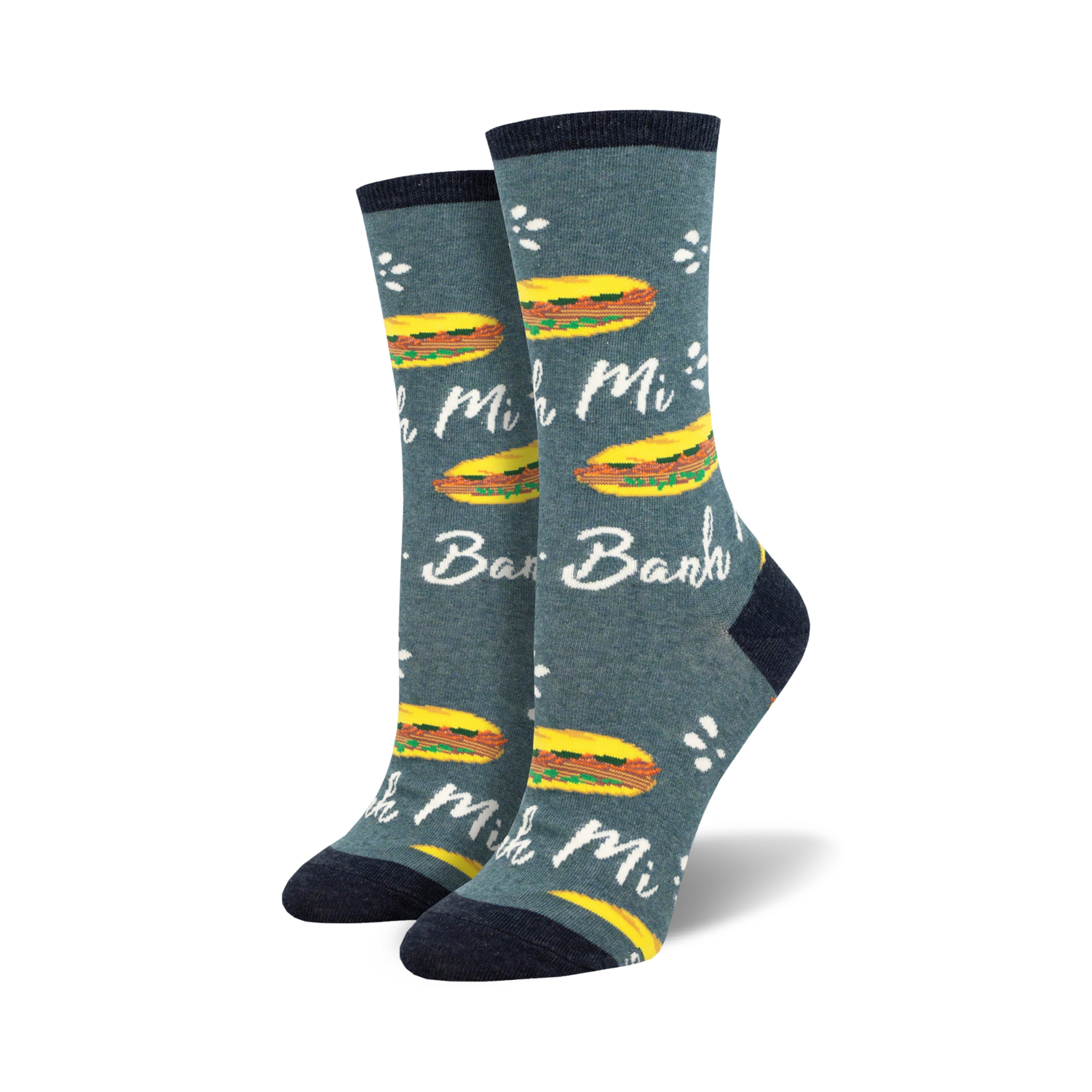 Banh Mi socks: The world's tastiest foot attire. These crew socks feature an all-over pattern of cartoonish Vietnamese sandwiches. They're blue and bright, just like the country they're named after! Warning: Wearing these socks may cause cravings for banh mi. You have been warned!