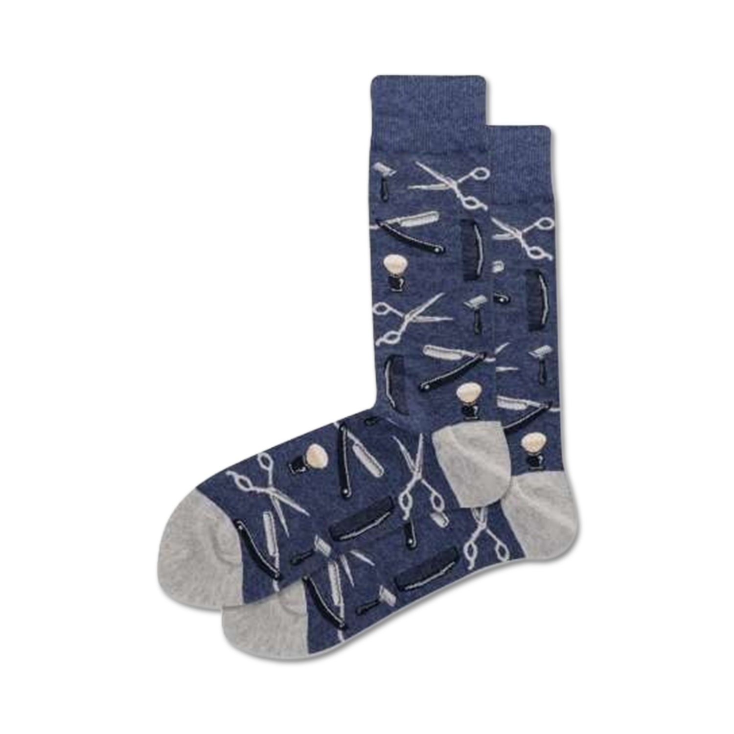 Who needs a haircut? Your feet! This pair of Barbershop Shave Tools novelty socks are covered with scissors and razors in a fun and fresh dark blue, white, and silver color scheme. Slip these crew length socks on and instantly transform your feet into a trim, sleek, and stylish pair of works of art. So, show off your feet, and your love for all things barber, and become the talk of the town with these Barbershop Shave Tools socks!