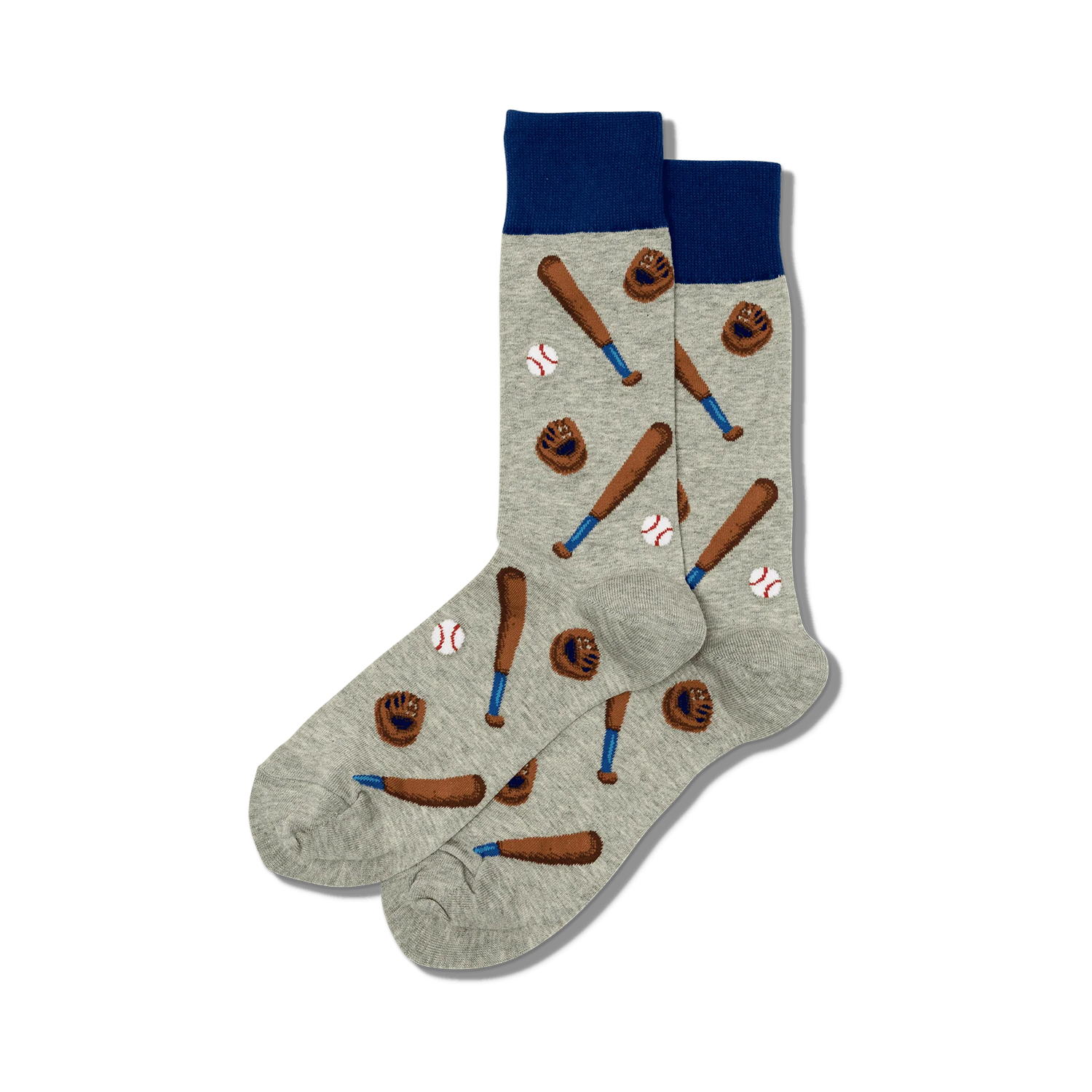 These gray crew socks are an absolute grand slam for baseball fans! The pattern features brown baseball bats crossed over each other as well as catchers mitts in between the bats. You'll hit a home run with these socks on the next game day or practice. Just make sure you don't get picked off!
