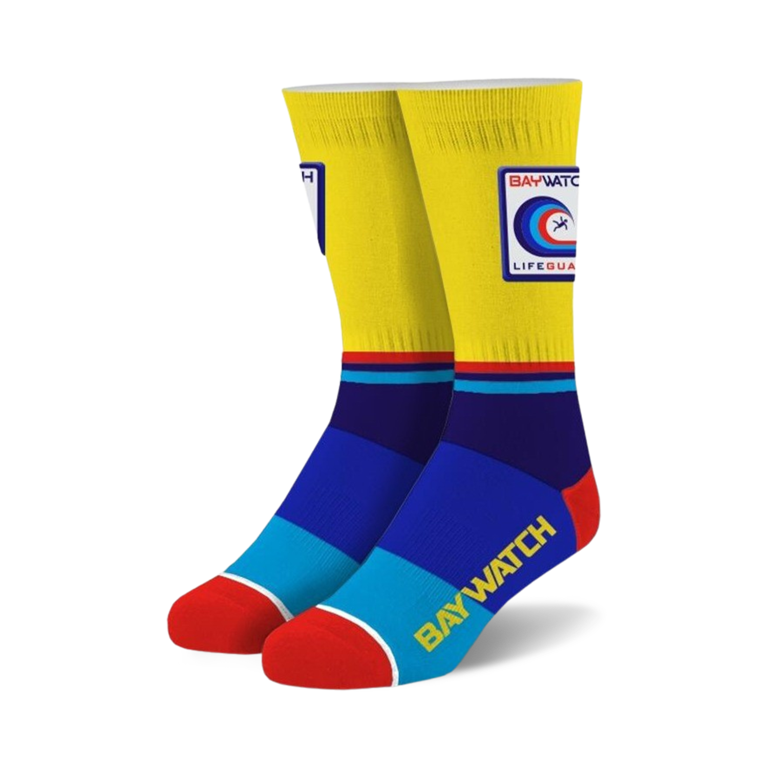 Step into the iconic world of Baywatch with these fun and vibrant socks. A touch of retro fun for fans of the iconic 90's TV show, with the easily recognizable stripe, toe design, lifeguard patch and bold embroidered logo. A perfect way to add a splash of color to your everyday wardrobe and show off your love for the beach.