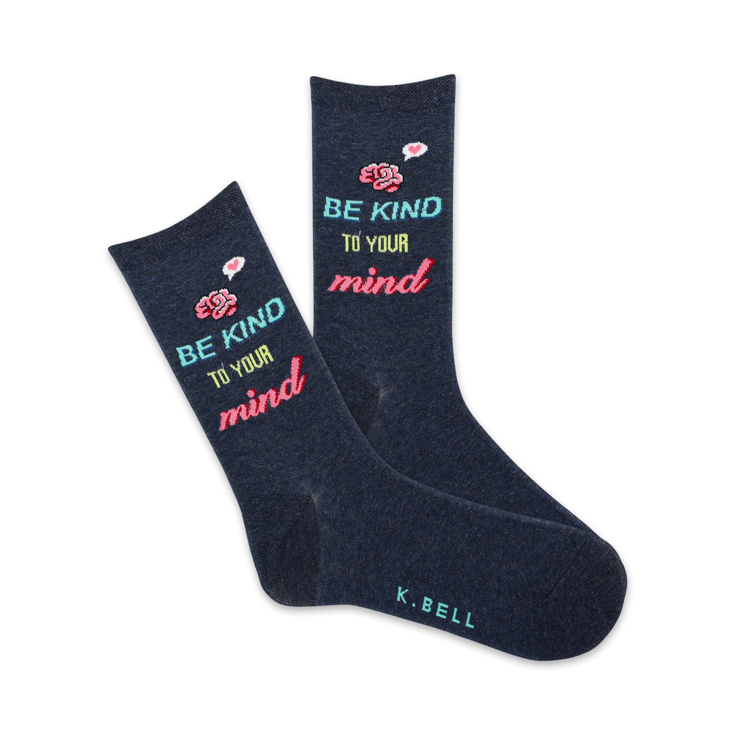 They're dark blue and say "Be Kind To Your Mind" on them. A pair of soft cotton blend crew socks that provide a comfortable fit and serve as a gentle reminder to prioritize mental well-being. They're perfect for those days when you need a little extra encouragement to take care of your mind.