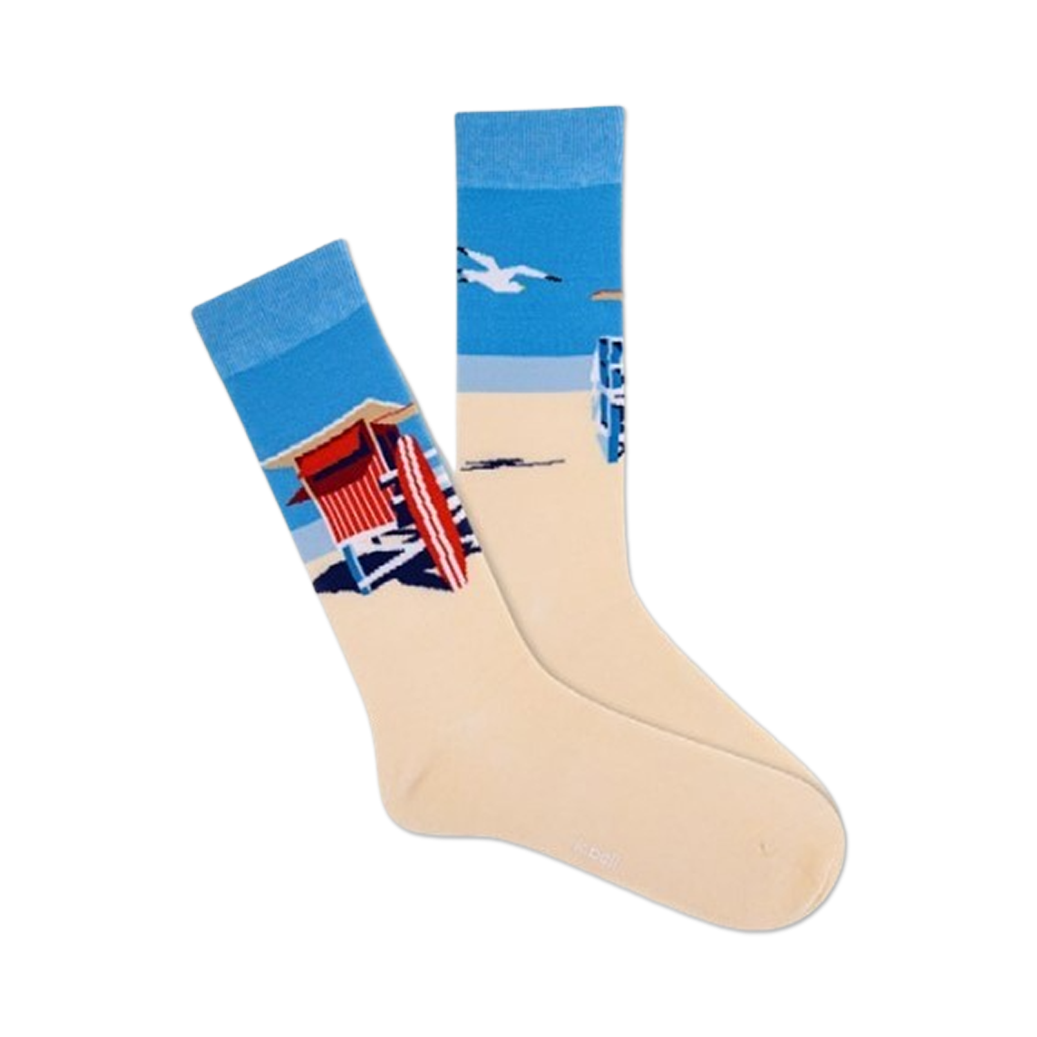 Beach Hut socks: Escape to the seaside with these vibrant crew socks! Picture this: white socks adorned with a blue backdrop, a parade of red and white beach huts, seagulls soaring overhead, and lush green palm trees. Get ready to dive into the ultimate summer adventure with these playful socks.