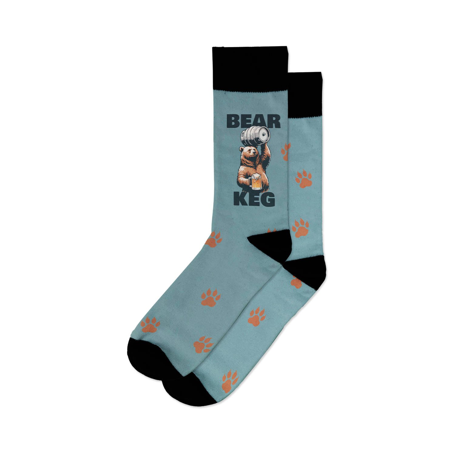 Calling all beer-loving fashionistas! Lace up your kicks with our Bear Keg Crew Socks and quench your thirst for unique style. Picture this: a vibrant blue canvas adorned with a brown bear, keg in paw, and "Bear Keg" emblazoned across. Scattered paw prints add a playful touch, making these socks the perfect conversation starter at your next pub crawl. Who knew socks could be so refreshing? Live the keg life, one step at a time!