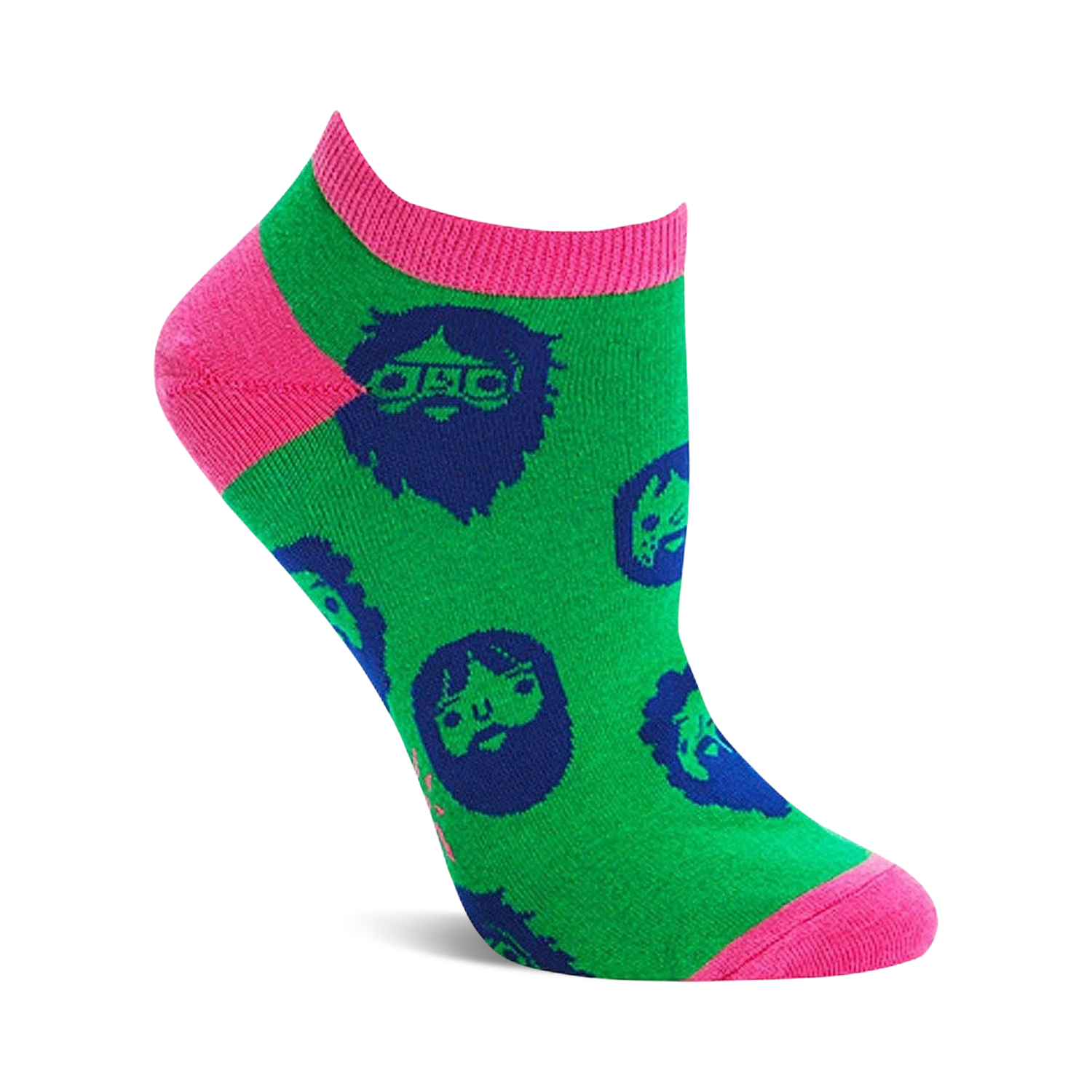 Has the thought of facial hair grown on you? Do you find the hairy look attractive and full of strength? Show off your love for the manliest of beards with these quirky ankle socks. Each cool pair comes in neon pink and green with several small bearded male faces in blue. Let your no-shave November support be shown all year round with these funny socks.