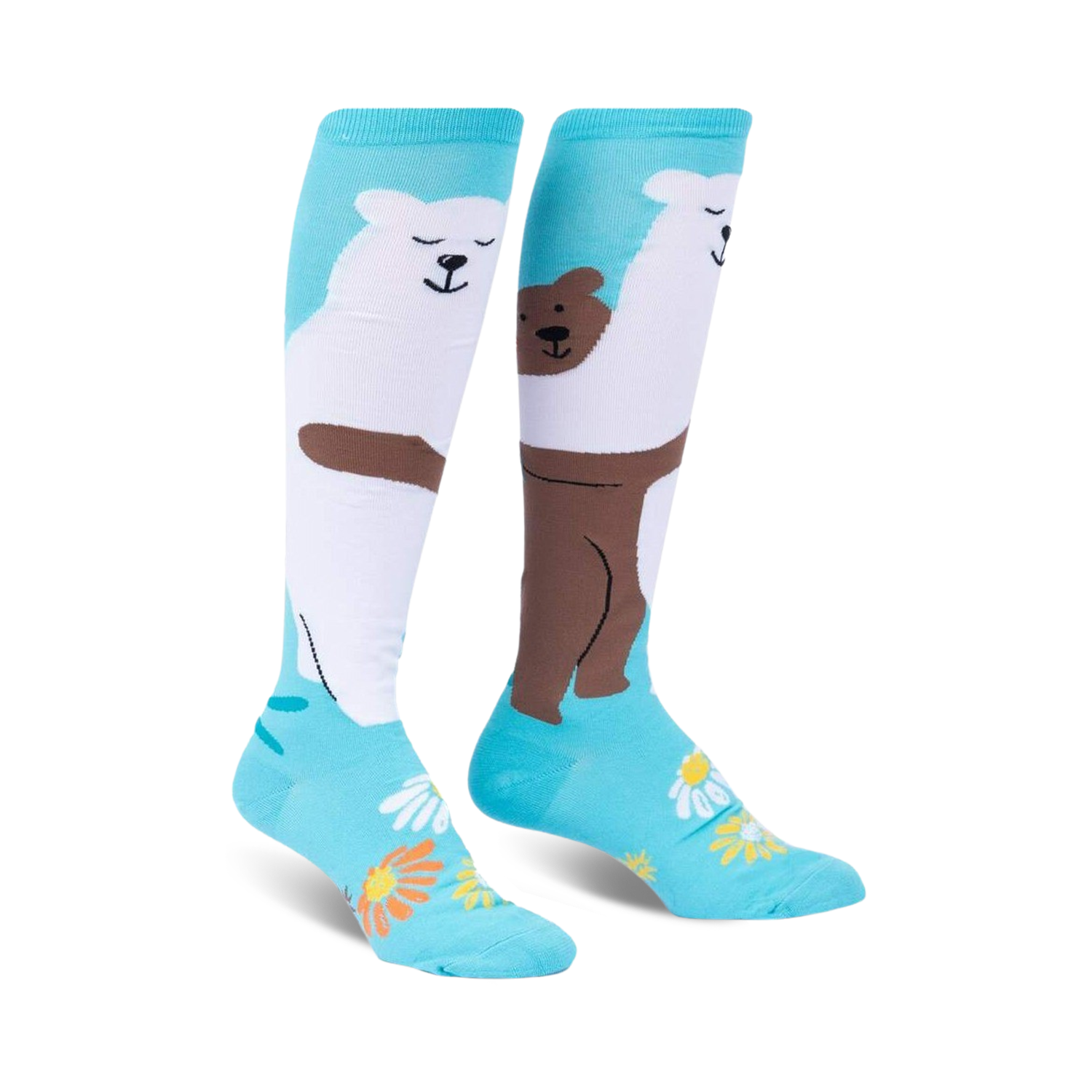 Grab a pair of our Beary Best Friends Bear Socks, and step into a world of cuddly cuteness! These knee-high socks for women feature a heartwarming pattern of brown and white bears hugging amidst vibrant yellow, orange, and pink flowers. Show off your love for these furry friends and remind yourself of the power of friendship with every step you take.