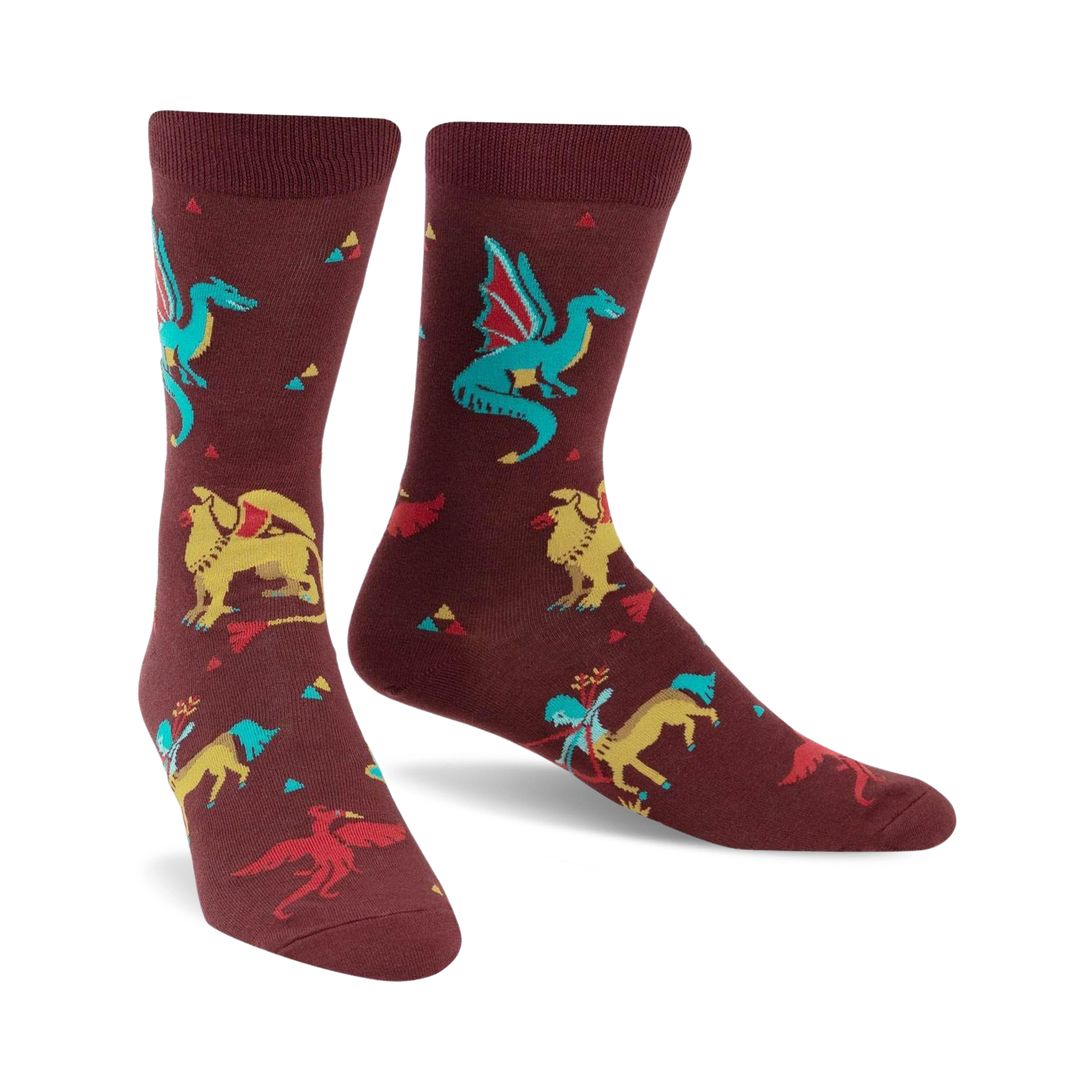 Beasts of Yore socks will transport you to a magical realm where dragons, griffins, and unicorns roam free. These mythical creatures in vibrant hues dance across a backdrop of geometric shapes, making these socks a whimsical fashion statement. Experience a touch of fantasy with every step!