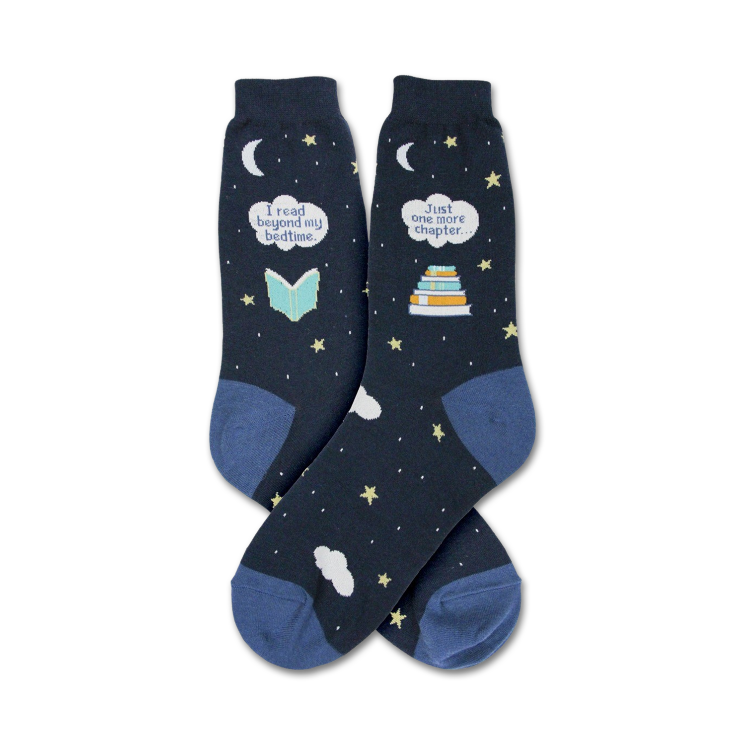 Curl up with a book and dive into a literary adventure with our Bedtime Reading socks! Featuring a cozy blue design adorned with books and stars, these crew-length wonders will make you want to stay up past your bedtime, just for "one more chapter." Show off your love for reading and embrace the magic of stories with every step you take.