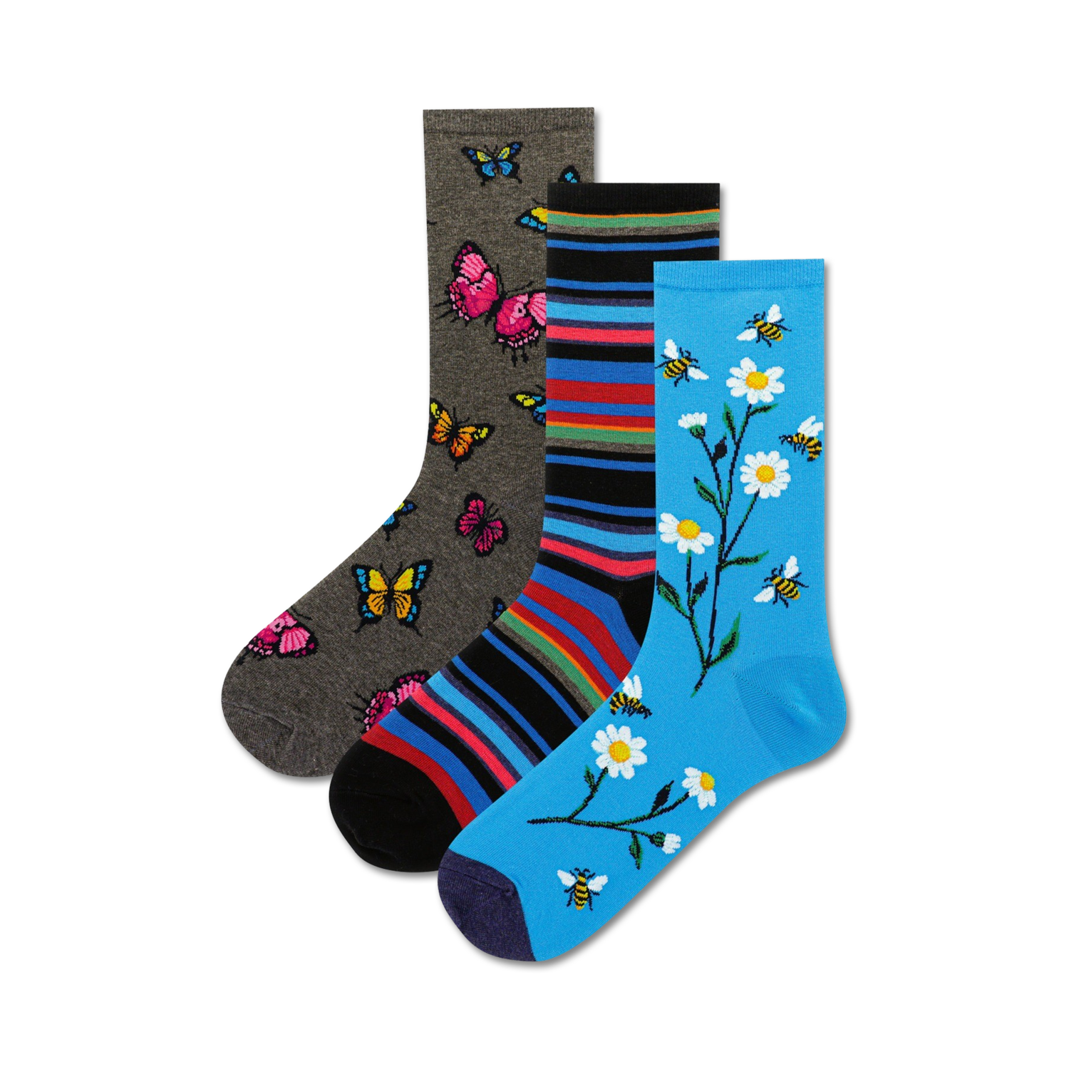 Buzzing with style, these Bee And Butterfly socks flutter with fun. Watch the pollinators dance across your feet with vibrant yellow, pink, blue, and orange hues, with soft gray and blue skies in the backdrop. Like butterflies, these women's crew socks can elevate any outfit with a pop of colorful cheer. Treat your feet to a wild garden of beauty with each step.