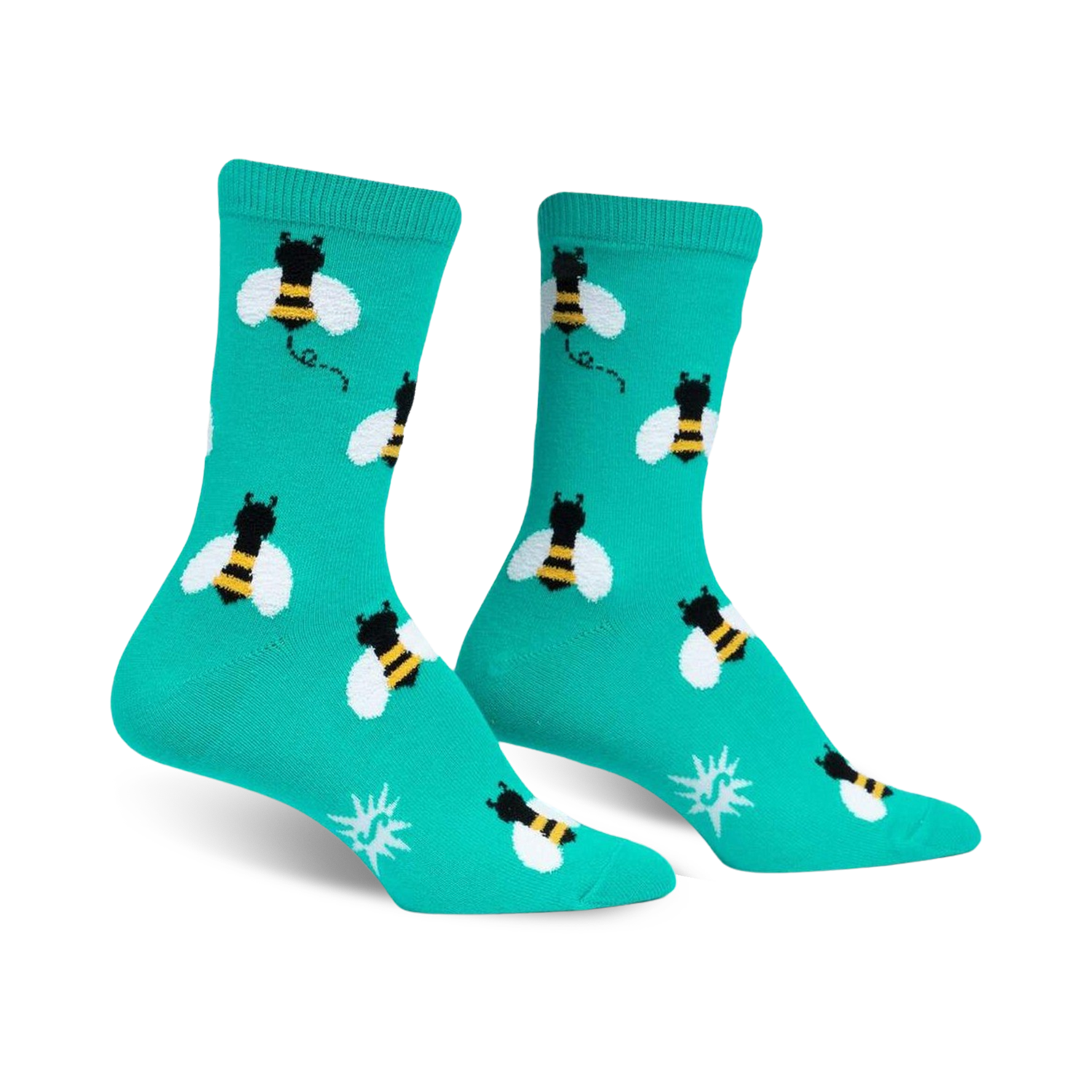 Bright teal crew socks covered in a cartoon bee pattern are sure to have you buzzing with excitement! These socks are a great way to add a touch of fun and whimsy to your day, whether you're wearing them to work, school, or just lounging around the house. They're also a great way to show your love for bees. Did you know that these tiny creatures are responsible for pollinating about one-third of the food we eat? So next time you slip on a pair of these socks, be sure to give a little thanks to the bees.