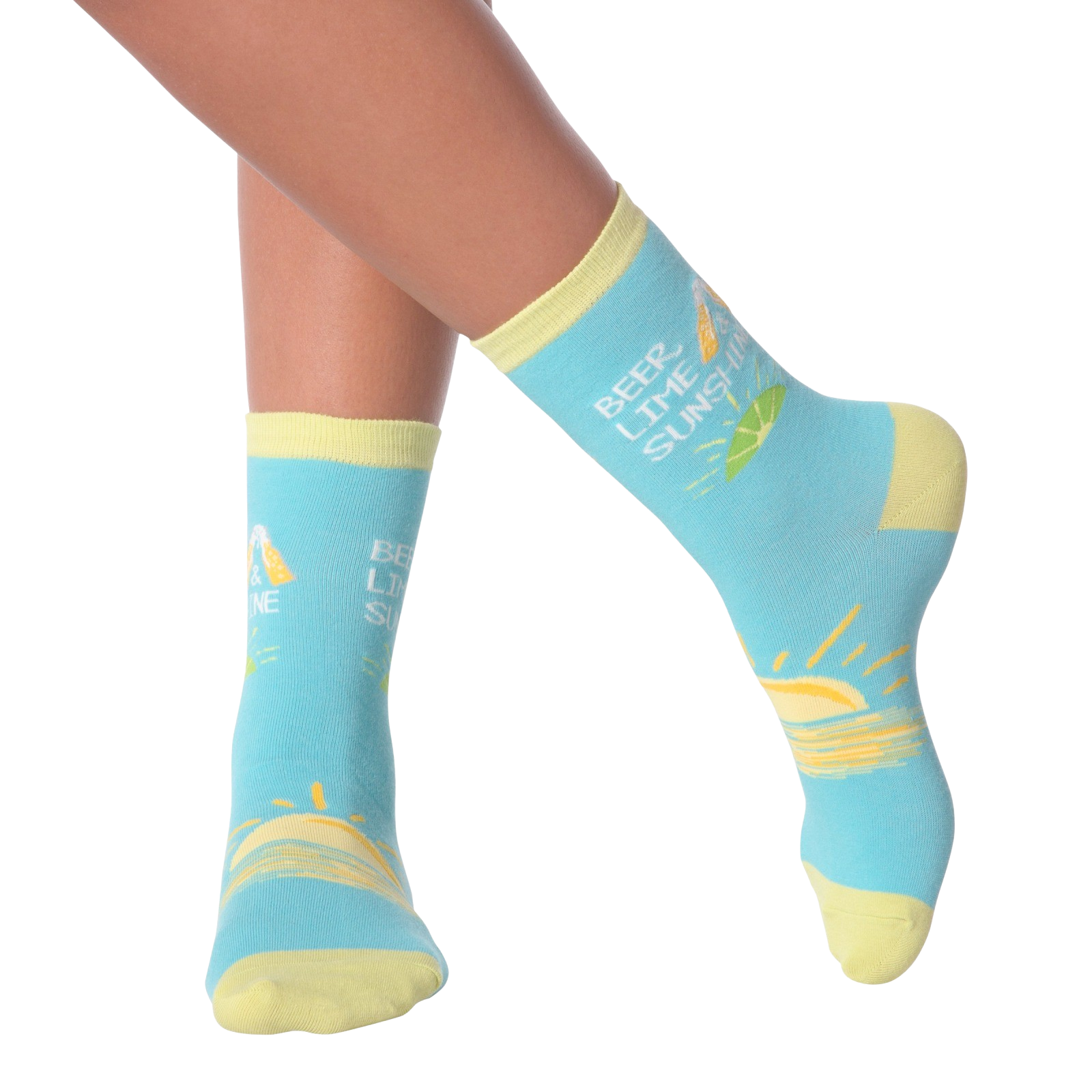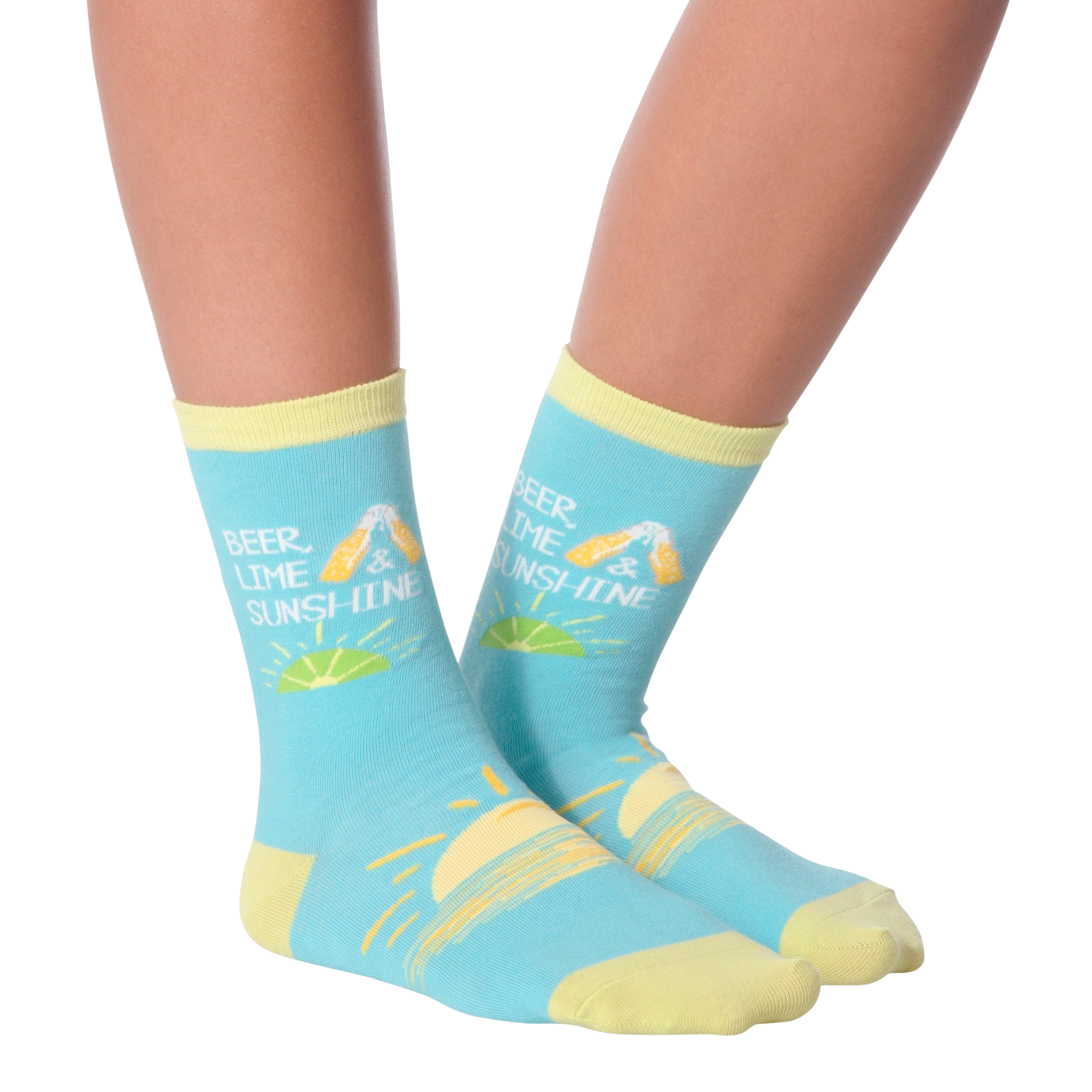Kick back, relax, and slip into a pair of these Beer Lime Sunshine women's crew socks. Just like your favorite summertime drink, these socks are bursting with refreshing lime green and golden sunshine designs, with the phrase "Beer Lime & Sunshine" to keep you feeling vacation-ready all day long. Who says socks can't have a good time too?