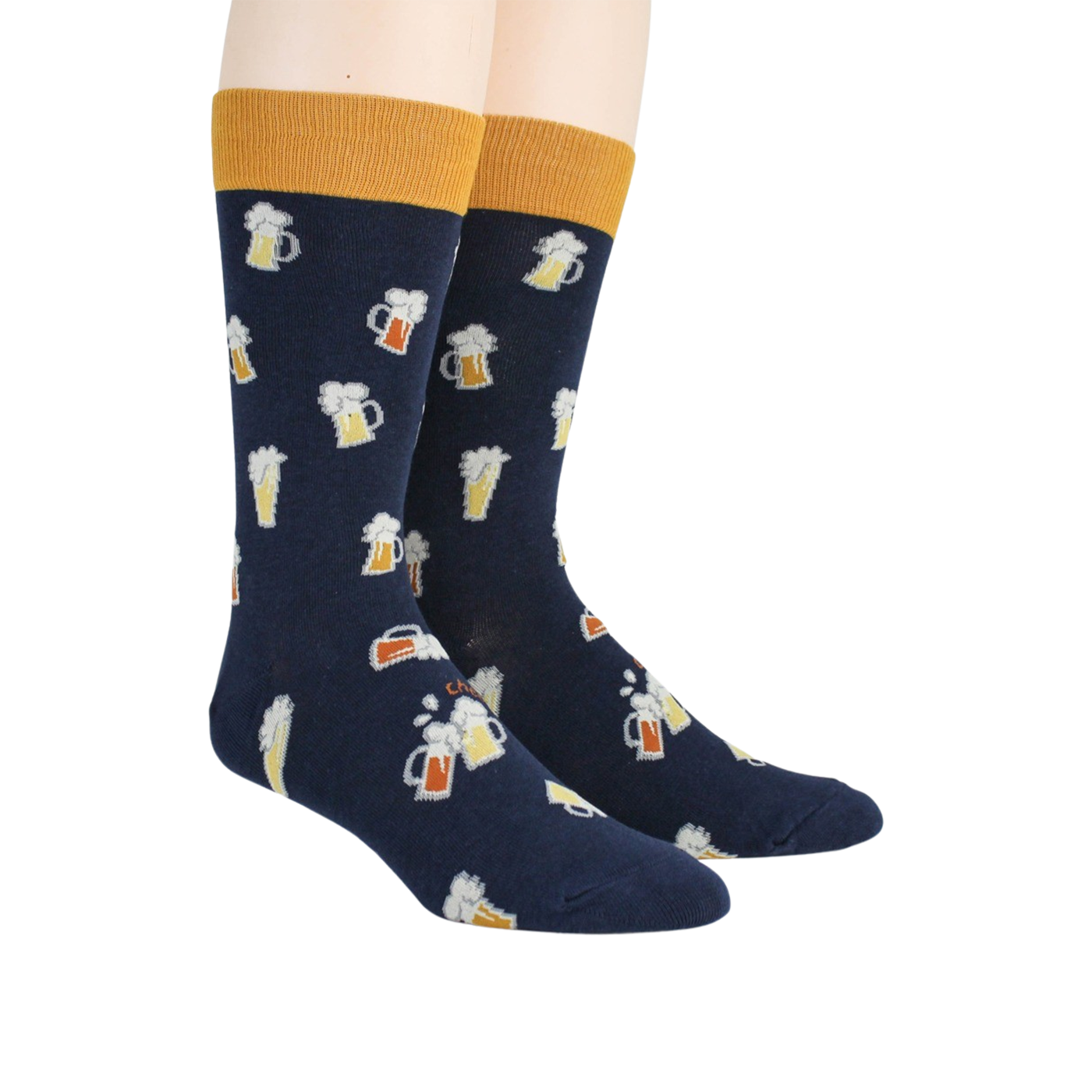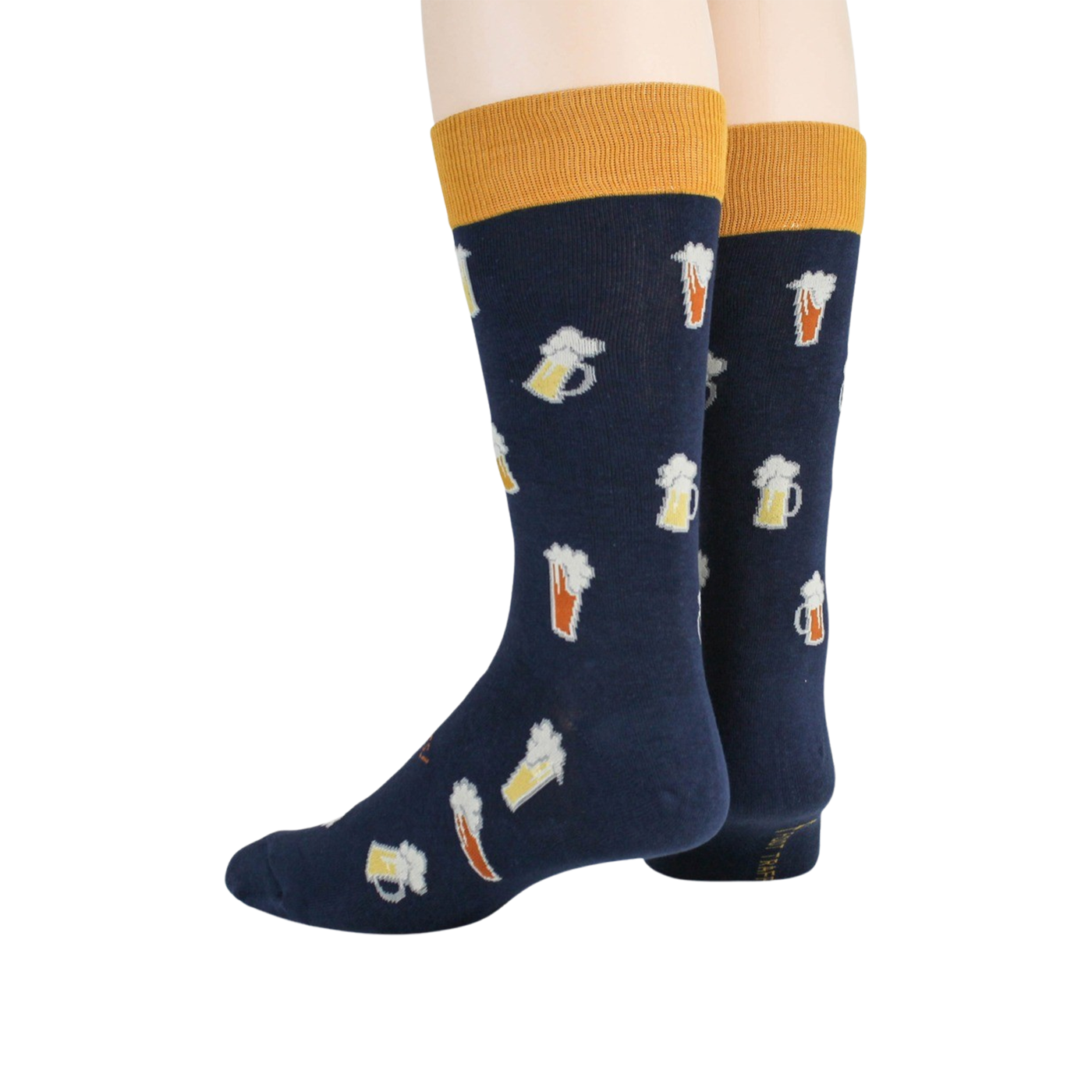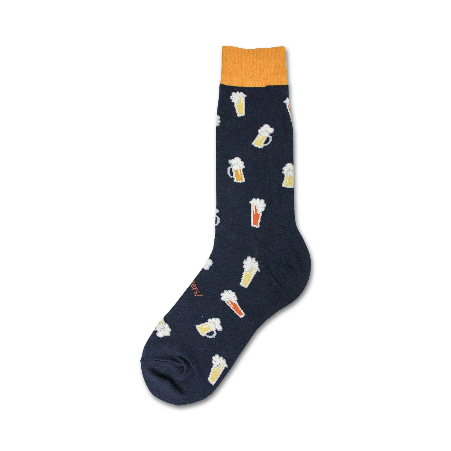 Don't let your feet feel blue in these beer stein socks! Perfect for the beer lover (or beer maker) in your life. An allover pattern of orange and yellow steins with white foam will have you dreaming of a frothy pint. The dark blue background creates a crisp, clean look, making these socks the perfect accessory for any casual outfit.