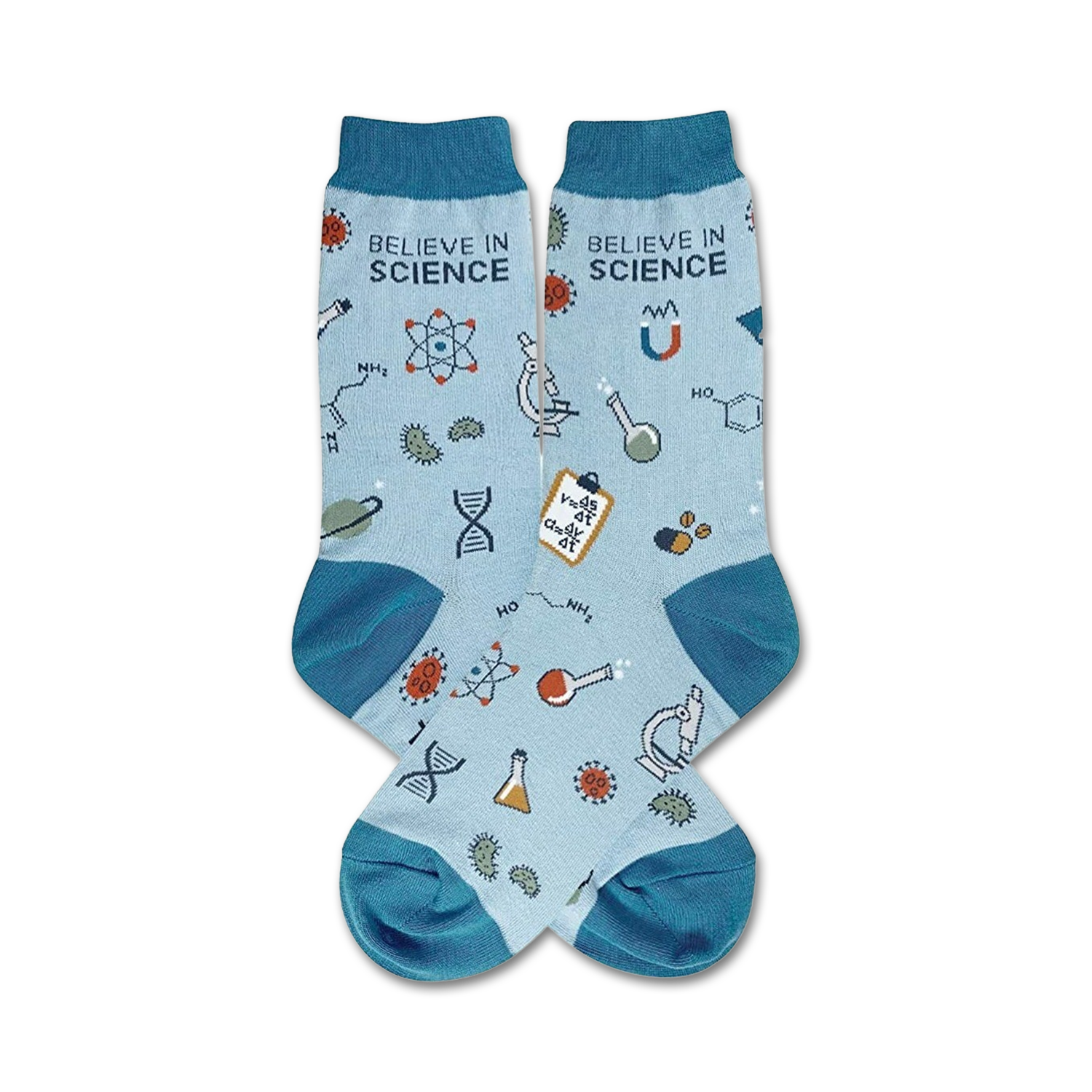 Explore the wonders of science with every step you take in these funky 'Believe In Science' women's crew socks. Adorned with atoms, molecules, beakers, microscopes, and planets, these socks are a playful reminder that even the smallest things can hold immense knowledge and power. Put on a pair and let your feet do the talking, spreading the message of scientific exploration and discovery wherever you go.
