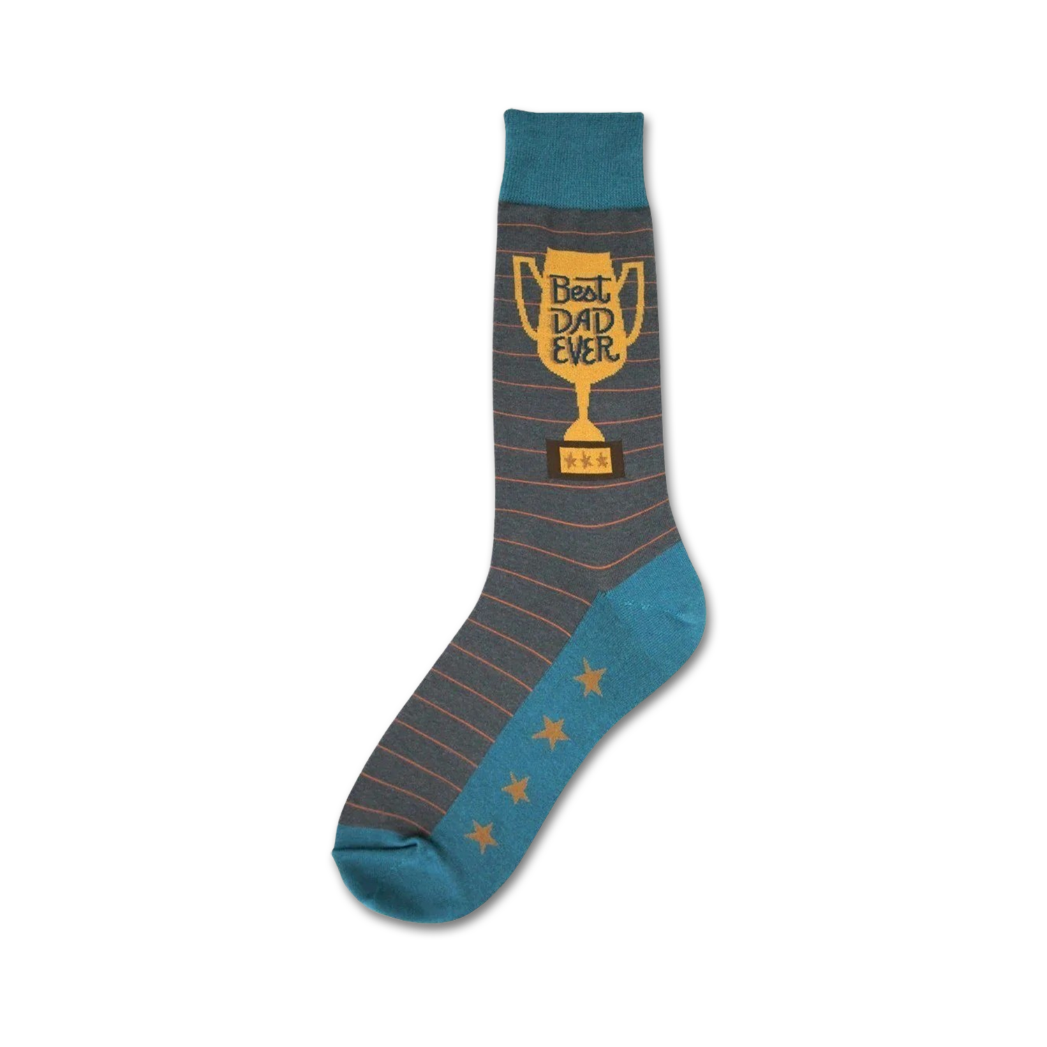 Proclaim your love for Dad with these socks to the world! Made with a combination of gray, blue, and white, these socks are made for men with an unyielding fondness of their paternal figure. The front of these crew-length socks emphasizes the phrase 'Best Dad Ever' above a trophy, while three stars accompany the text. Whether you're searching for a gift or looking to add to your collection, these socks will remind you that even Dad can have a few aces hidden up his sleeve.