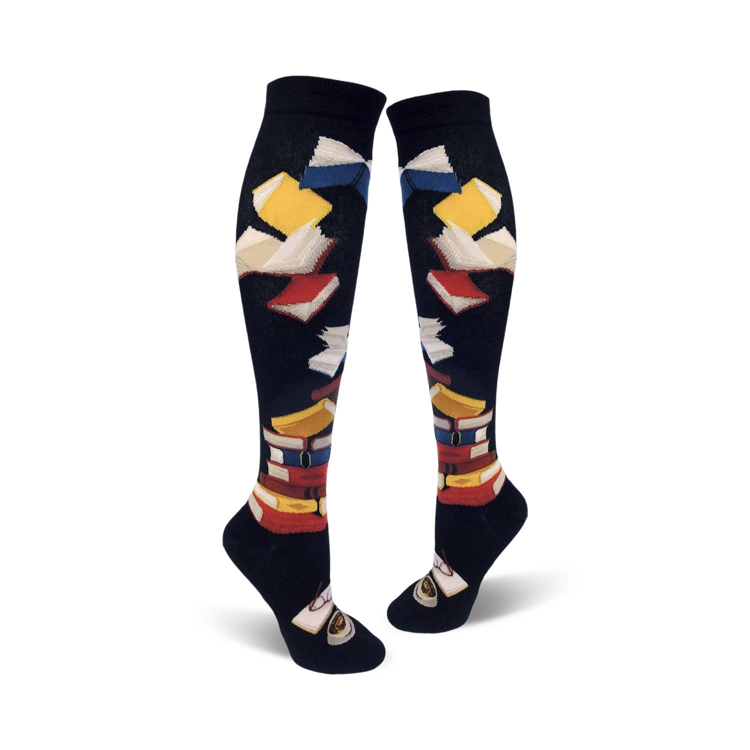Knee high Bibliophile socks for women with a literary bent. Let the words and colors dance on your feet! Blue socks adorned with colorful books. A book lover's declaration of love for the magic of reading!