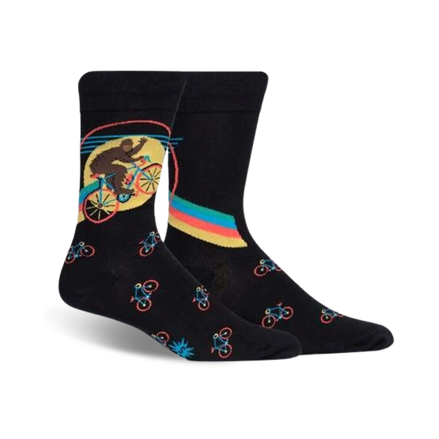 Bike-Squatch socks are a guaranteed head-turner, featuring a pattern of multicolored bicycles and a large image of a brown Sasquatch riding a bicycle on a black background. It's like an inspirational meme you can wear on your feet! These socks are for the man who loves the wild and the outdoors, and doesn't mind having a little fun.