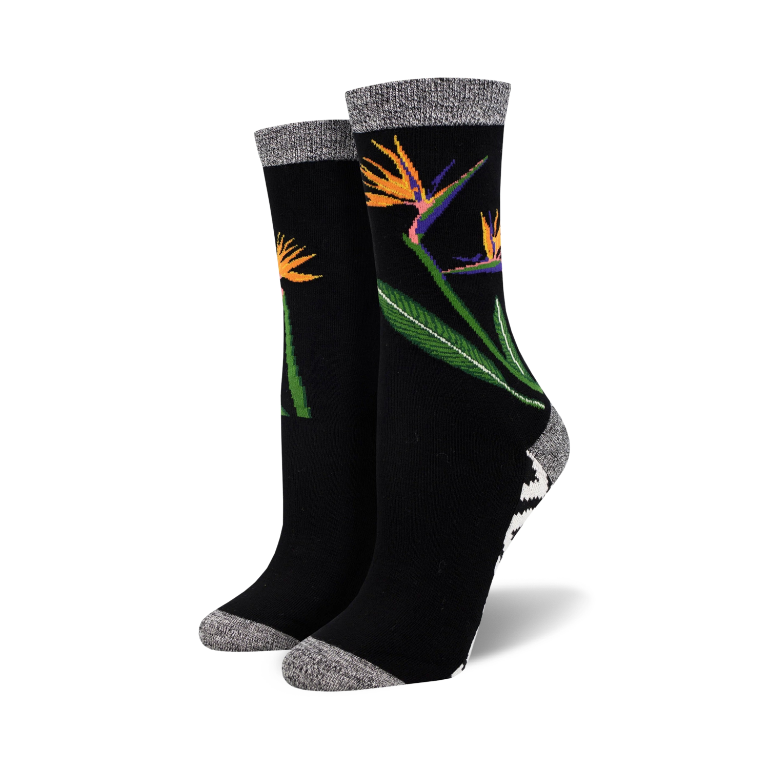 Strut your stuff with the Birds of Paradise Crew Socks! Bloom into the spotlight wherever you go in our tropical floral socks. Surround your feet in a bevy of orange, yellow, and green blooms with long, slender petals and verdant leaves set against a dazzling blue background. With a pop of black at the toe and heel, accented by crisp white geometric designs on the heel, you'll be blooming marvelous. Get a pair and join the flock of fabulous feet!