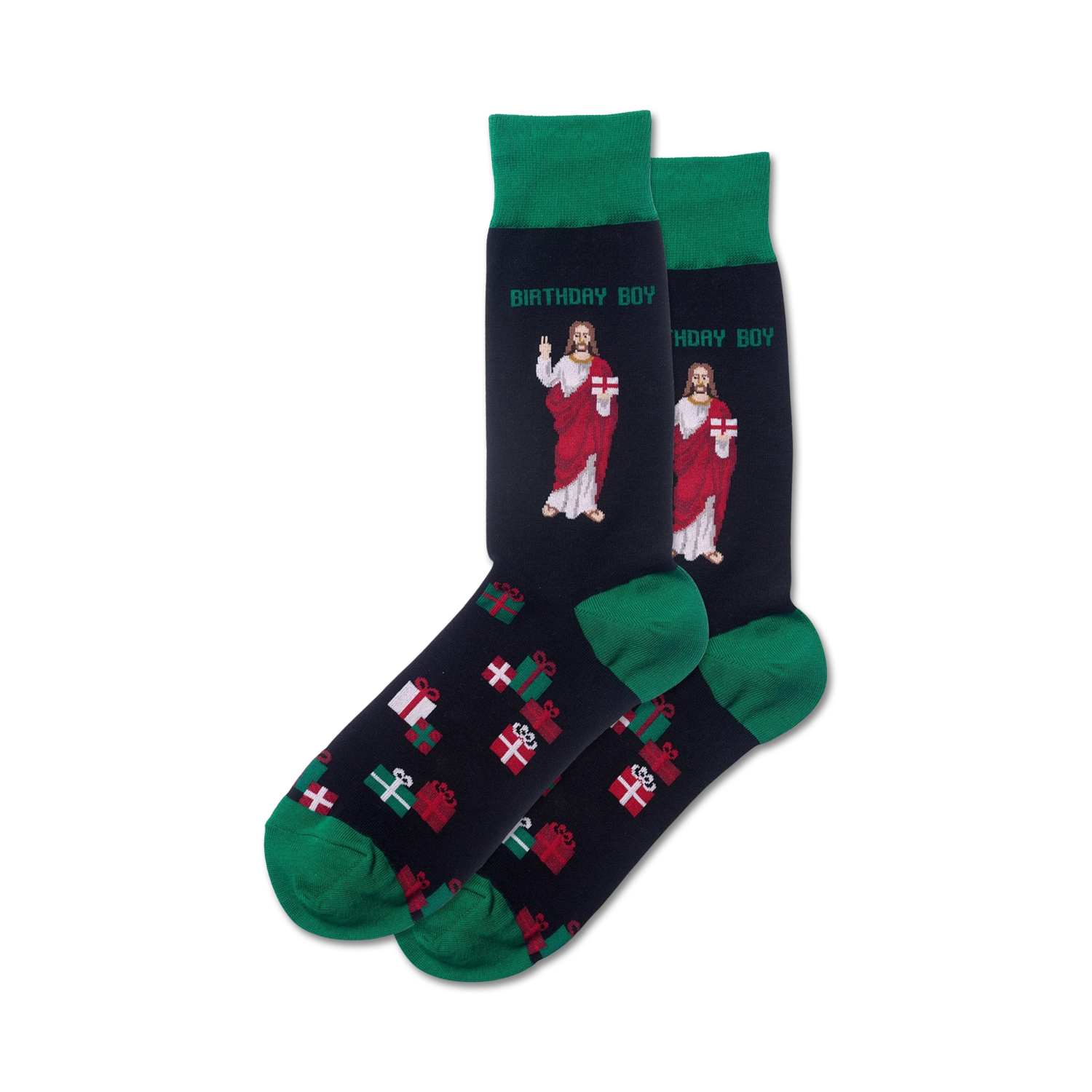 Praise Jesus! These fun and unique socks are the perfect way to spread Christmas cheer. With a pattern of pixelated images of Jesus holding presents, these socks will surely get a chuckle from anyone who sees them. The green top with white "Birthday Boy" text adds a festive touch. Show your love for the Lord with these Birthday Boy crew socks.