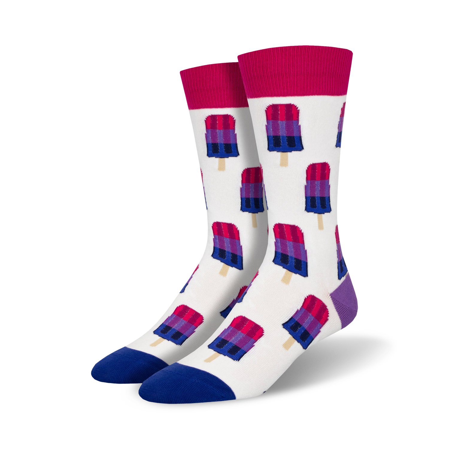 Embrace your true colors with these Bisexual Pops socks! With popsicle-inspired patterns in pink, purple and blue, they're the perfect way to show off your pride and personality. Whether you're hitting up a Pride parade or just lounging at home, these socks will make a statement! Plus, they're made for everyone so you can share the popsicle love. Get your pair today and let your socks do the talking!