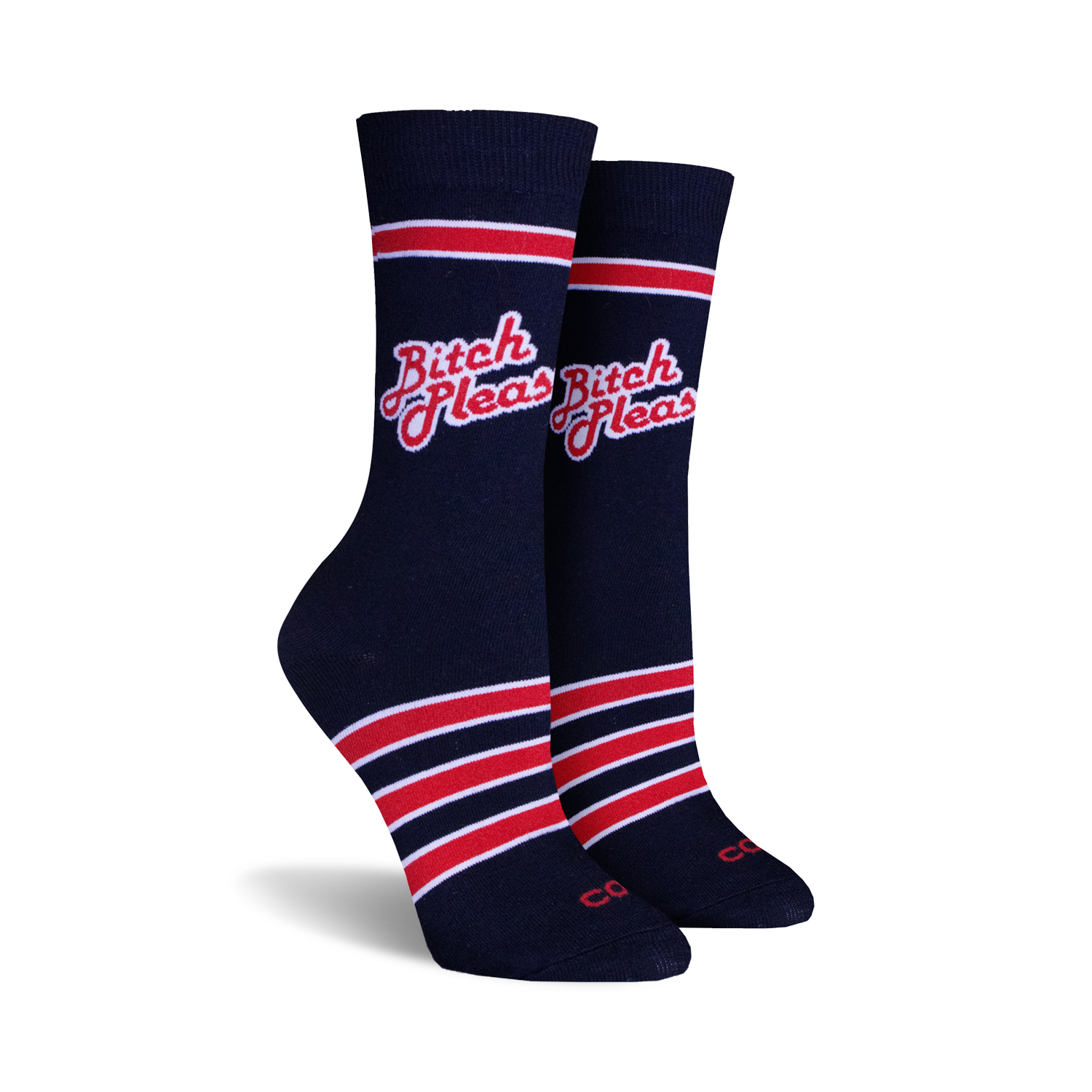 Bitch, please. You can't wear just any old socks, you need socks that make a statement. These sassy socks are made for the bold and fabulous. With their dark blue background, red and white striped accents, and "Bitch Please" emblazoned across the front, these socks demand attention. Grab a pair and show the world who's boss.