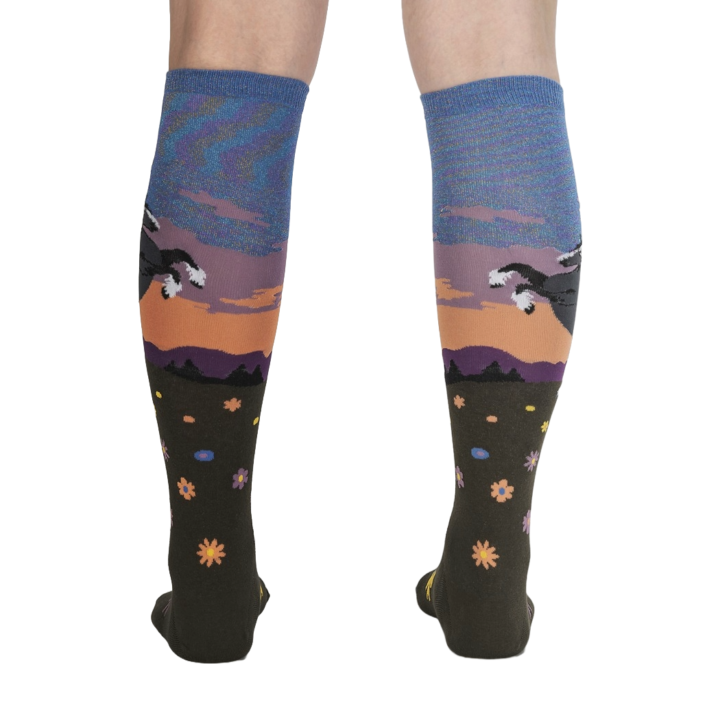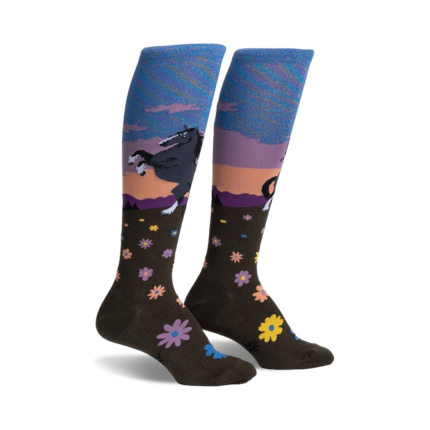 Gallop into the sunset with Black Beauty, our knee-high socks for women. These socks showcase a dark brown floral pattern with a striking black horse leaping over a fence, all set against a breathtaking purple, pink, and blue sunset. Inspired by the classic novel, these socks are just as resilient as their namesake. Wear them to remind yourself that even in the darkest of times, beauty and grace can prevail.