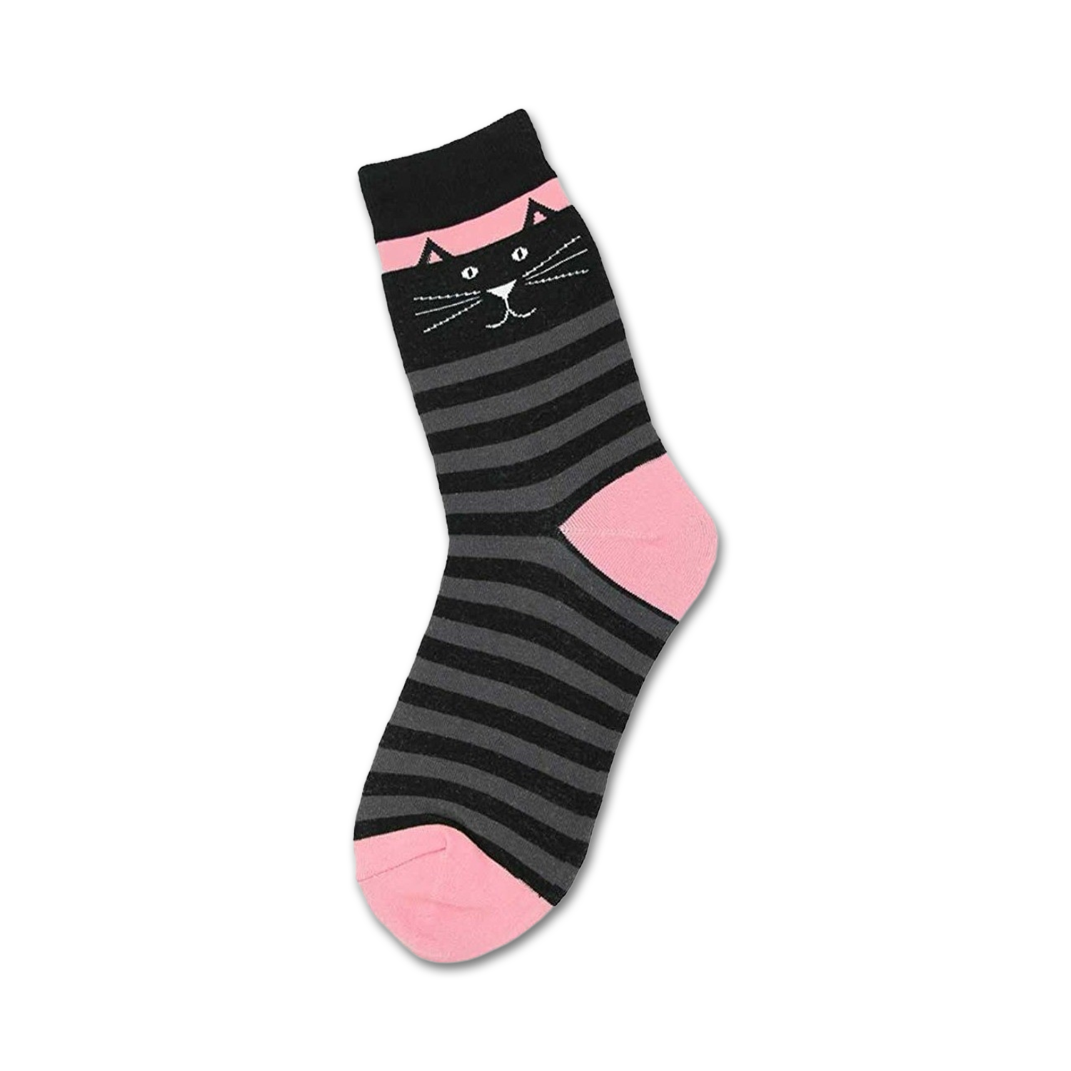 Black Kitty Crew Socks: Purrfect Accessory for Cat Lovers! With a black canvas and gray stripes, these socks channel the mystique and playfulness of our feline friends. The bright pink toe and heel adds a touch of quirky charm, and a black cat face adorns the front, complete with white whiskers and a shiny pink nose. Get ready to put your best paw forward in these cat-tastic socks designed for divas, dames, and damsels who love a good cat nap!