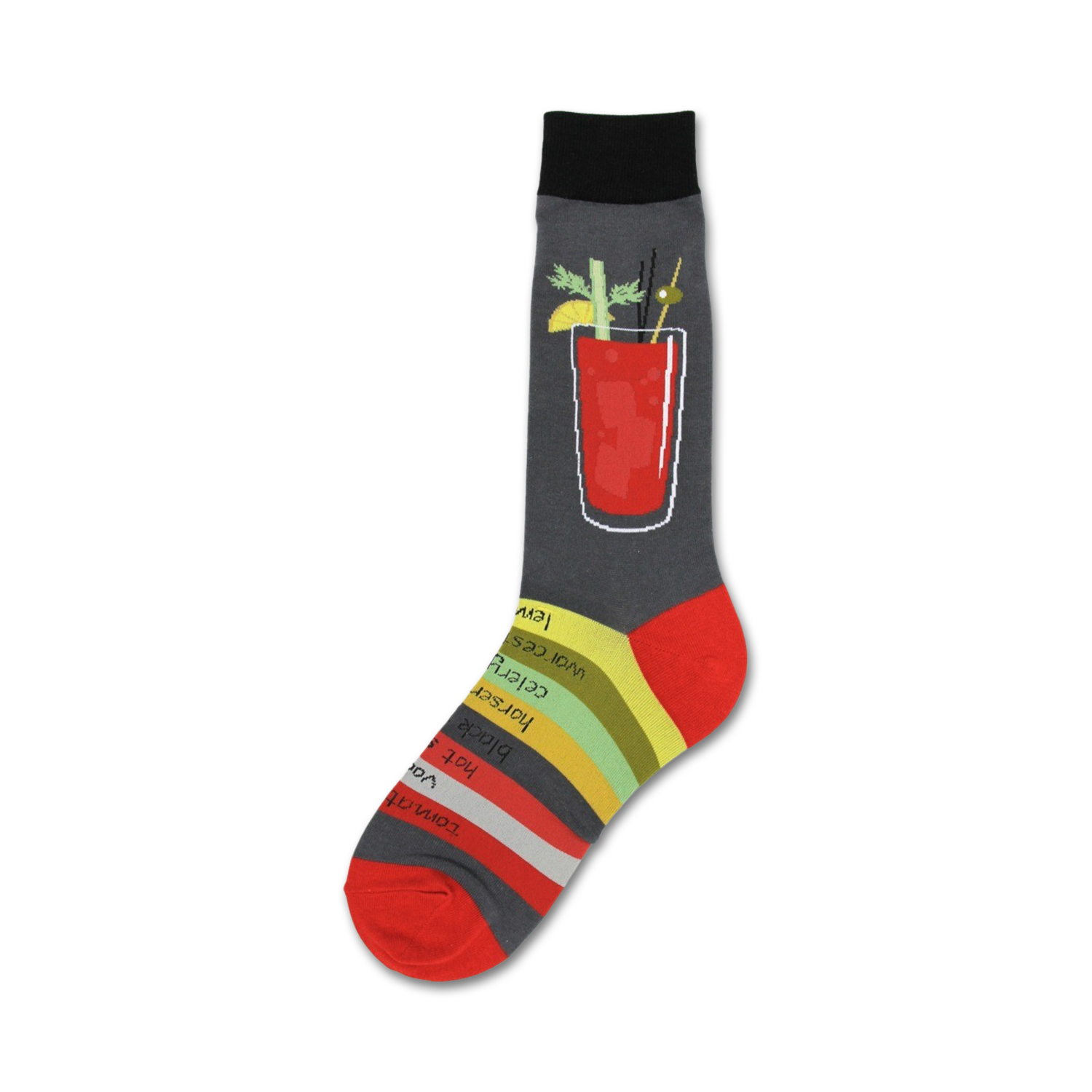 Bloody Mary socks: the perfect way to add a little fun to your sock drawer. These gray socks with multi-colored stripes at the top and a Bloody Mary drink with a celery stalk and olive on the front, are sure to make you smile every time you put them on. Whether you're a fan of the classic cocktail or just like fun socks, these are sure to be a hit. After all, they're like a party in a sock, minus the hangover. Cheers to that!