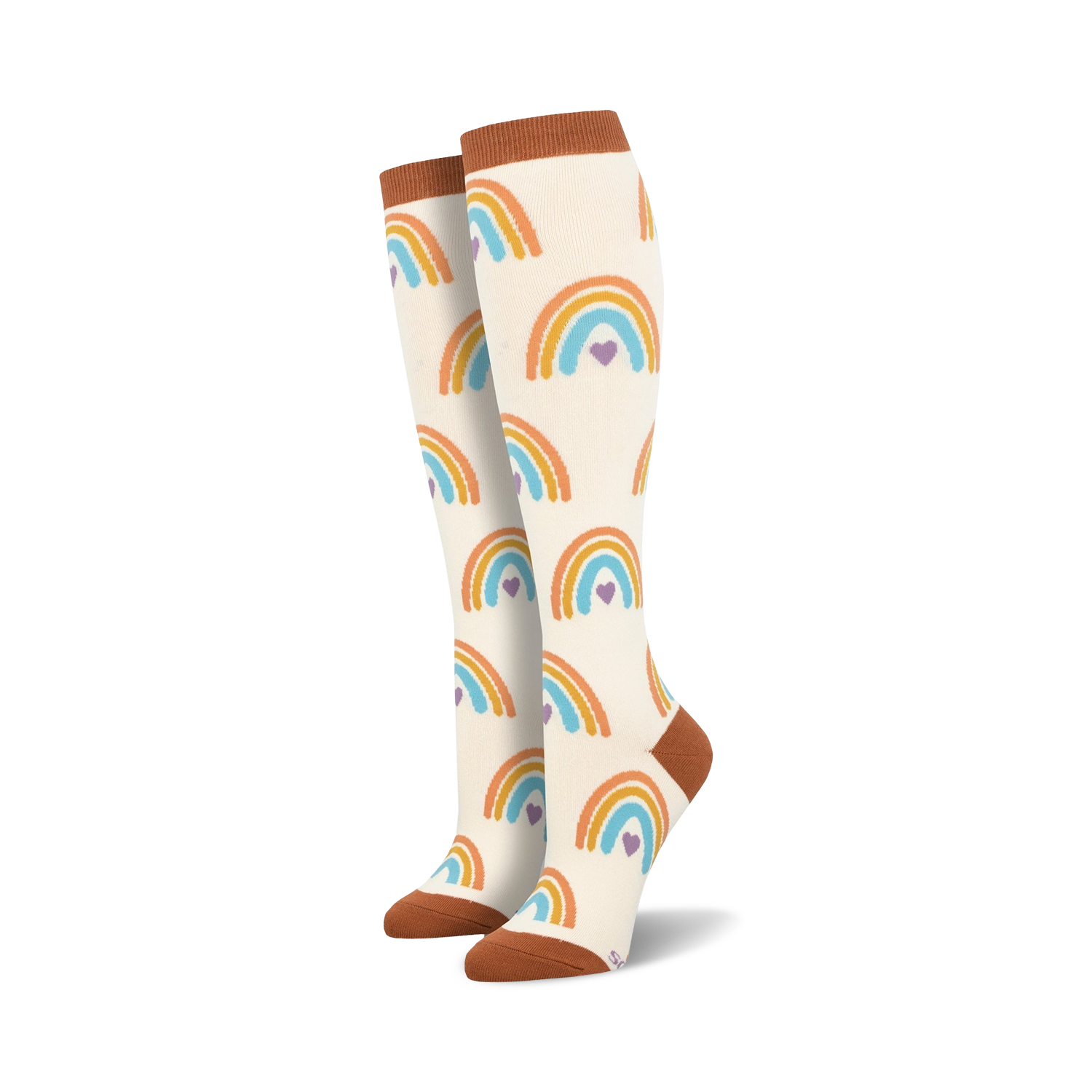 Add a little laid-back sunshine to your day with these Boho Rainbow socks. They feature a creamy off-white background, covered in a sweet, repeating pattern of arched rainbows. Each visible rainbow design has an outer arc in a soft orange, a middle arc in a serene light blue, and a little purple heart nestled in the center. The cuffs, heels, and toes are a grounding terracotta brown, perfectly complementing the calm color palette. These socks are all about bringing a bit of gentle joy and colorful comfort to your everyday.