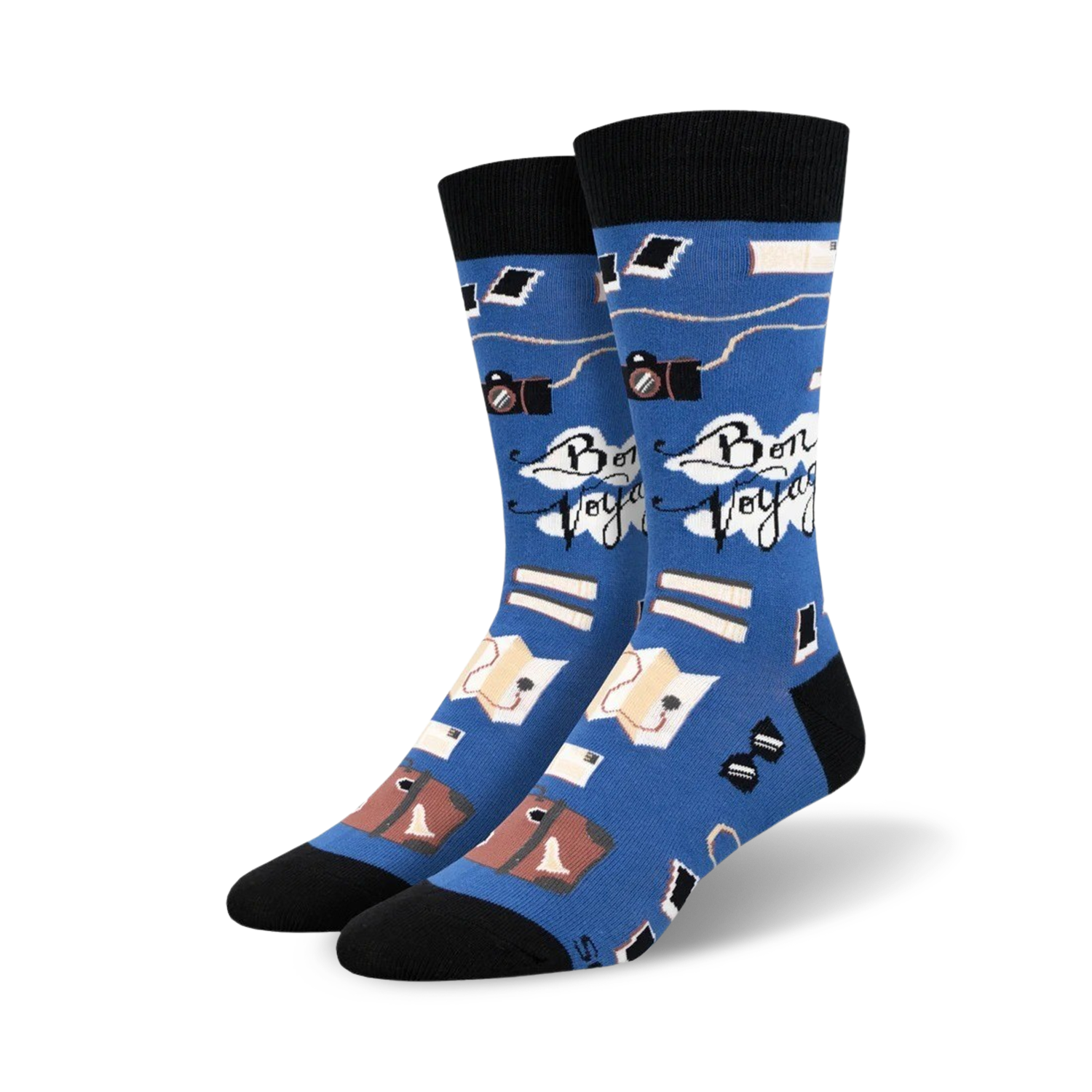 Wanderlust-inspired Bon Voyage socks featuring luggage, sunglasses, cameras, and books to fuel your next adventure. Blue skies and smooth sailing with these crew sock staples. The perfect gift for the frequent flyer. You won't be grounded with these socks. Crew up your style with Bon Voyage socks and let the good times roll. You'll be the toast of any trip, no jet lag needed!