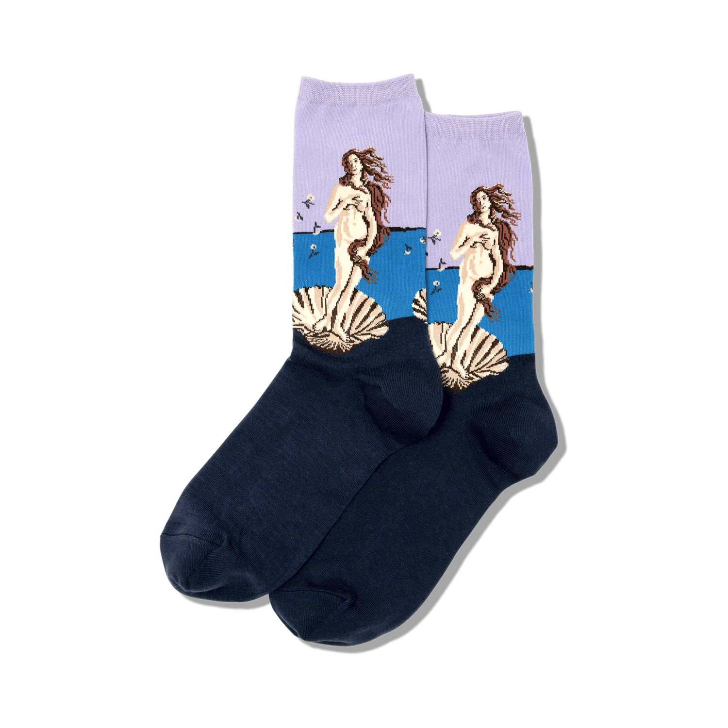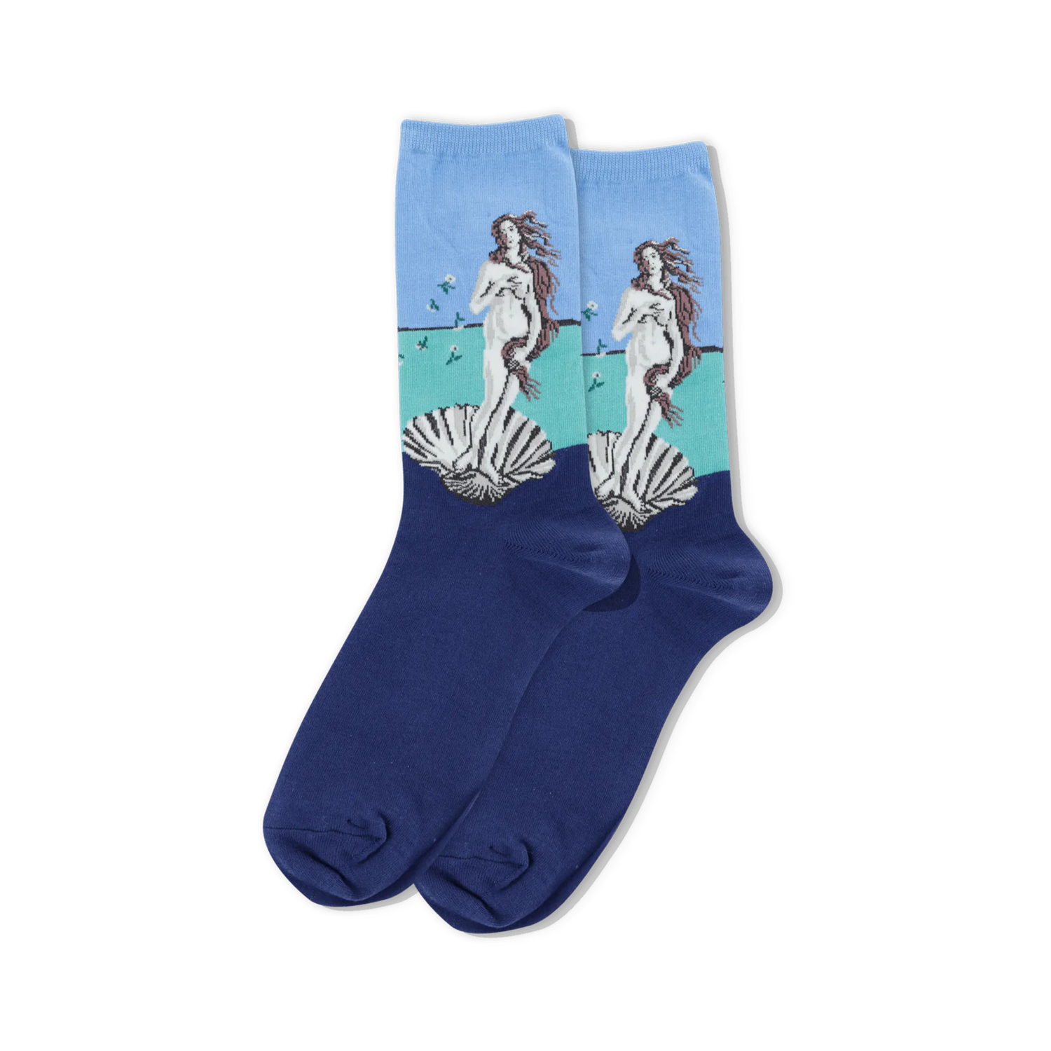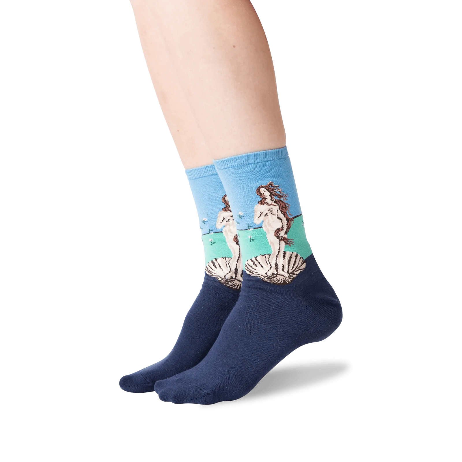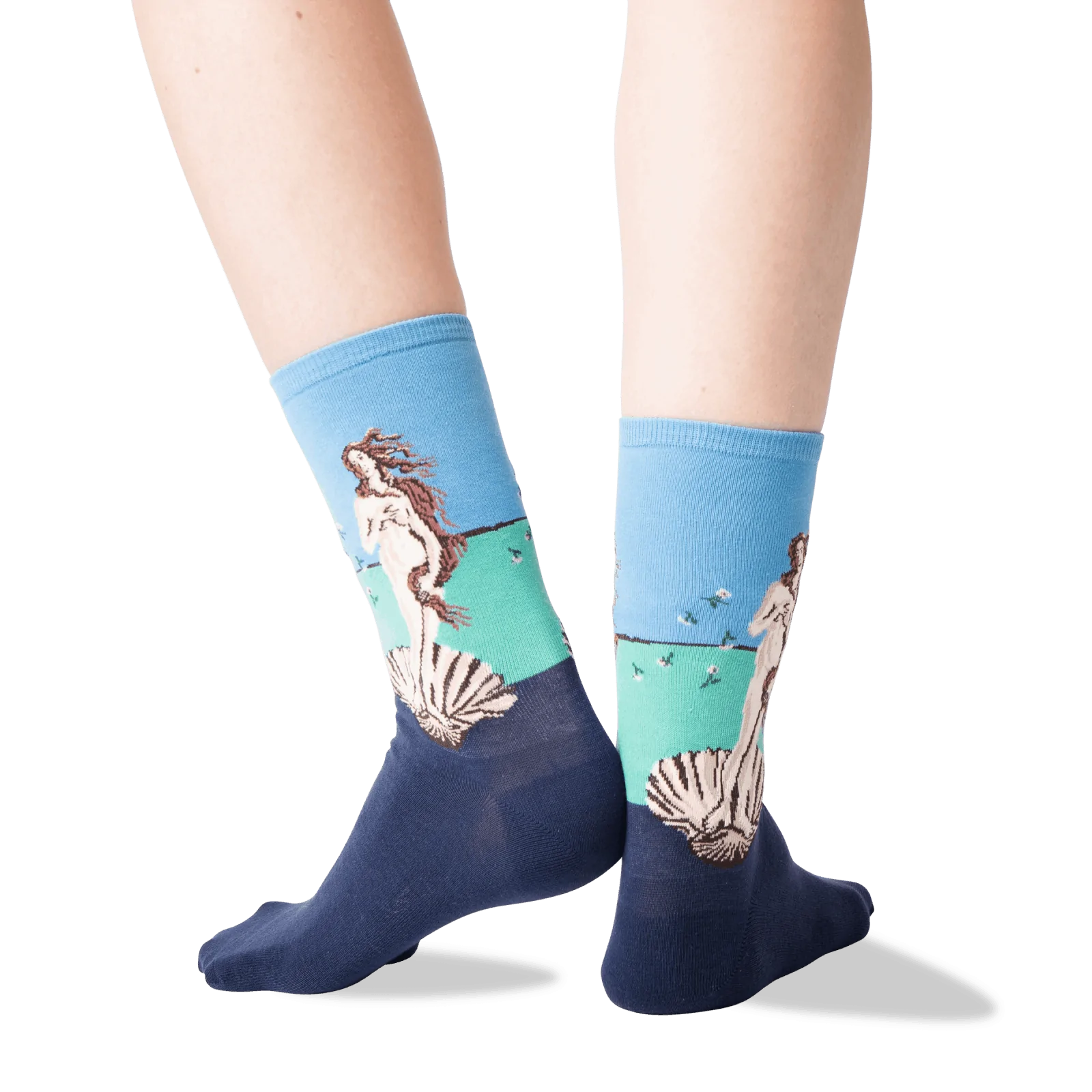 Walk in the footsteps of love, beauty, and fertility. This cool pair of crew socks feature Sandro Botticelli's iconic work of art "The Birth of Venus". The lovely socks feature the goddess Venus emerging from the sea in all her glory. Support the embodiment of feminine power, strength, and beauty with these heavenly socks adorning your feet.