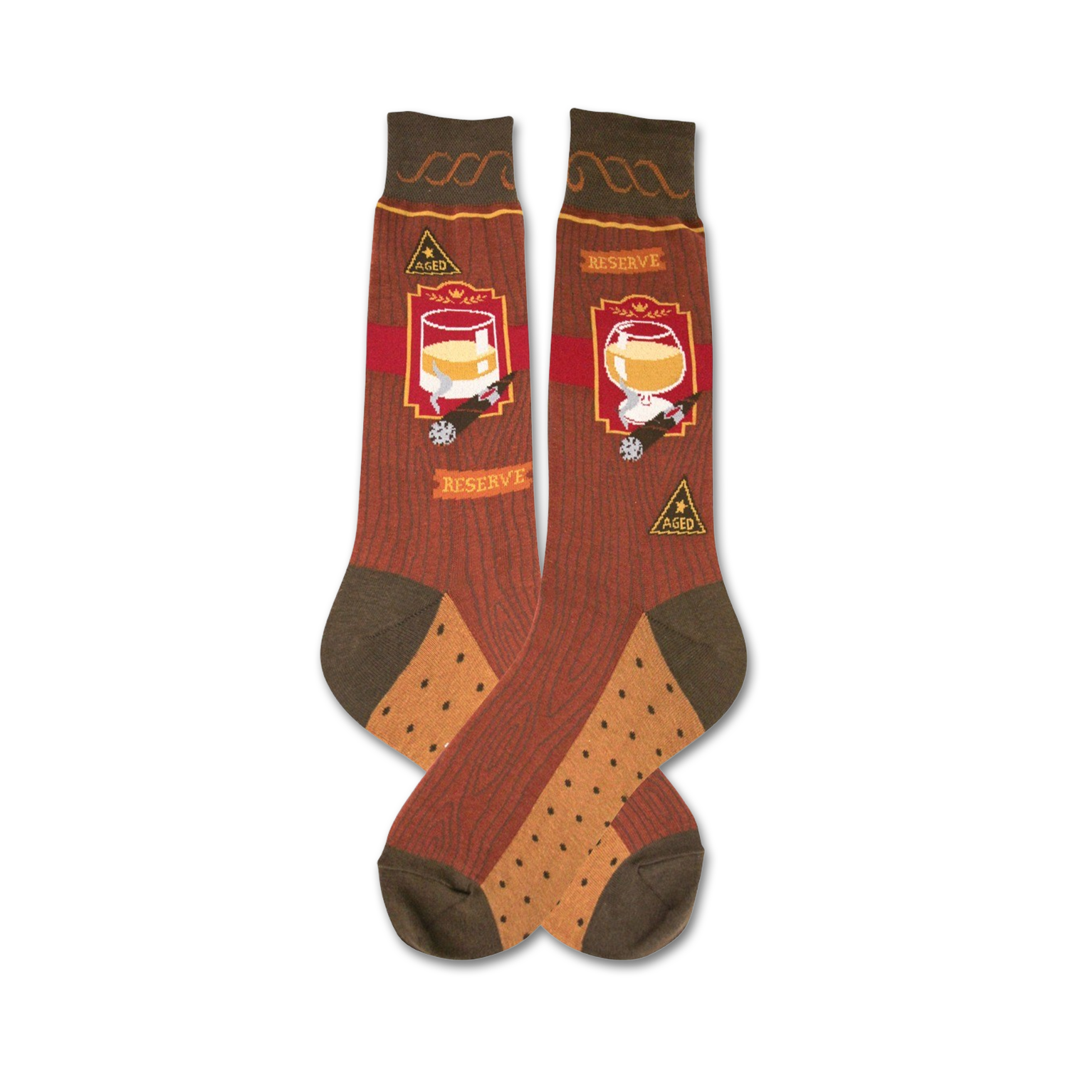 Bourbon and Cigar socks - For the whiskey and cigar fanatic. Picture this: A snifter of brandy or cognac on each foot smells delicious with a thick cigar on top, framed with a red and white striped border, just like the ones at the bar. All this on a sturdy pair of brown socks with small polka dots. You might want to grab a pair of these Bourbon and Cigar socks just to keep one as a delightful reminder of that time you got a finger in your brandy, and a burn on your mustache!