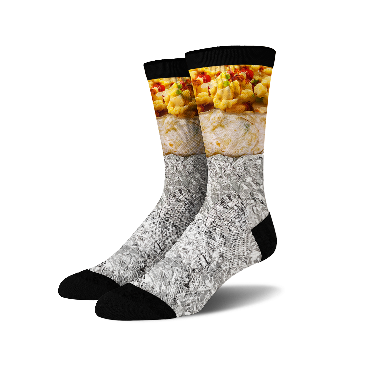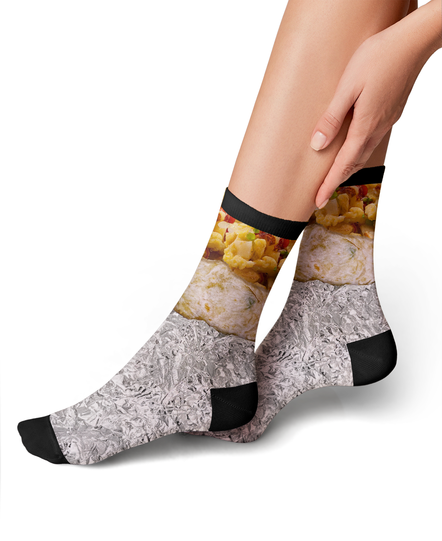 Ever wake up craving a breakfast burrito but don't have the time? Now you can have your breakfast and rock it too with these Breakfast Burrito 360 socks. These crew length socks for men and women feature a realistic image of a breakfast burrito stuffed with eggs, sausage, peppers, and cheese. They're the perfect way to spice up your sock game and start your day off right.