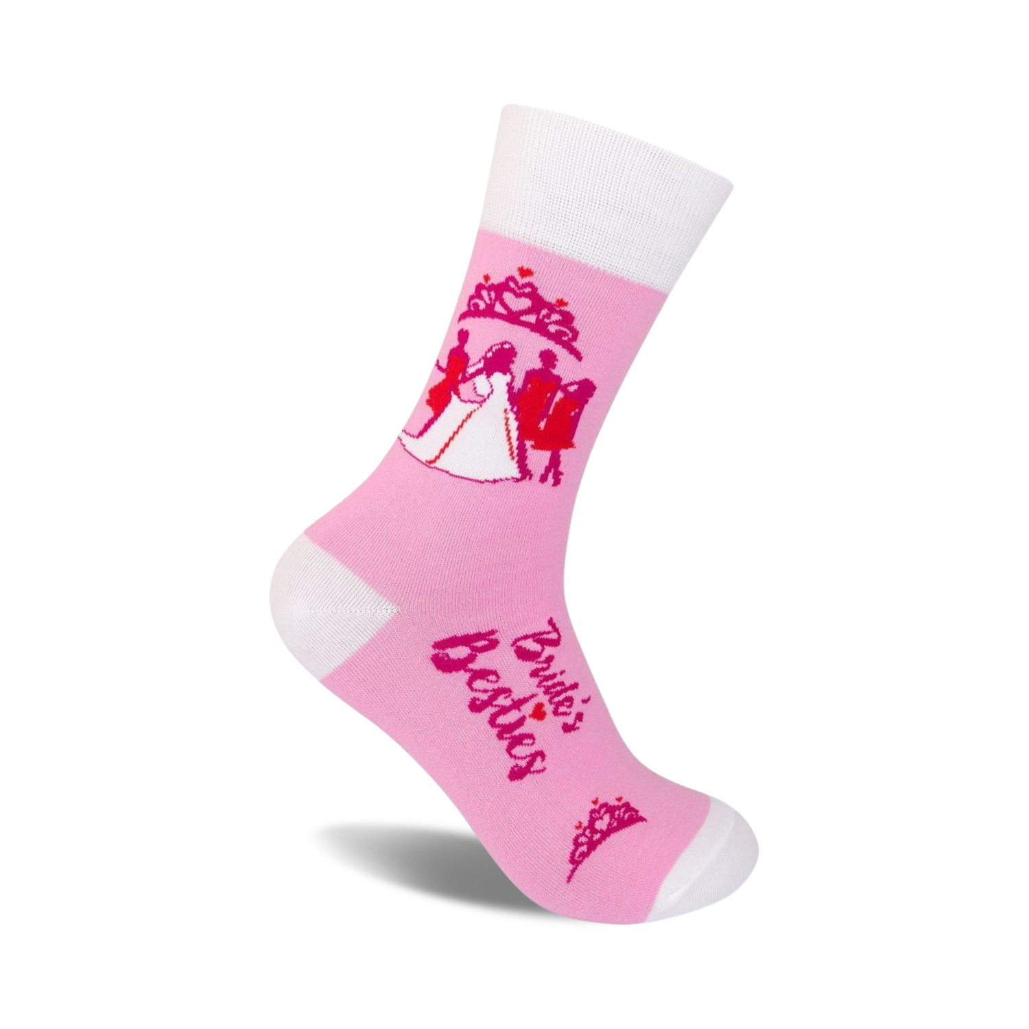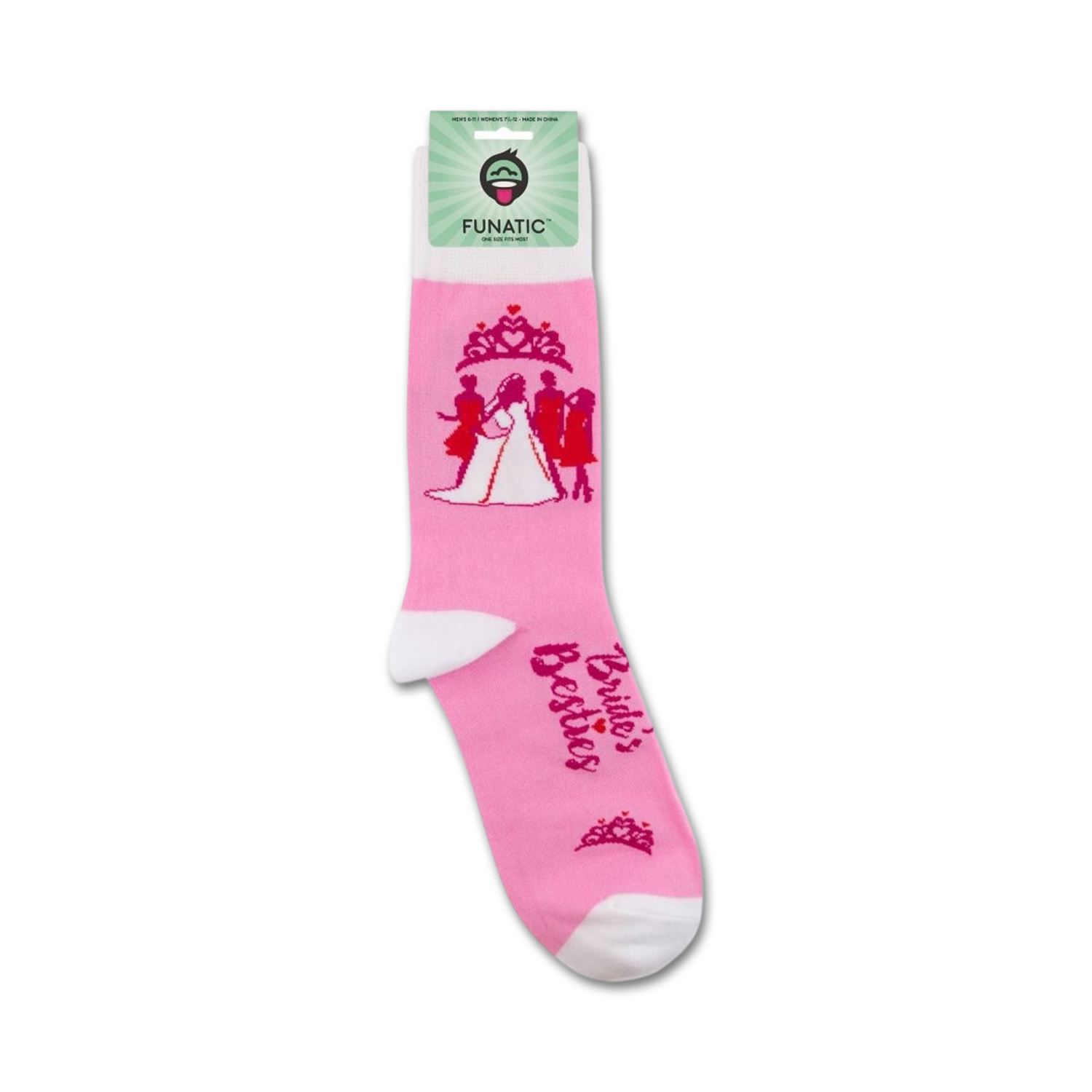 Get your feet ready to party with our "Bride's Besties" crew socks! Splashed in playful pink and white, these socks are your official badge of honor in the bridal squad. Decked out with a cheeky bride and her bridesmaids silhouette, they're the ultimate accessory for the big day or the wild bachelorette bash. So, slip into these bad boys and let's kick the celebration up a notch – because every step should be as fun as the wedding cake is sweet!