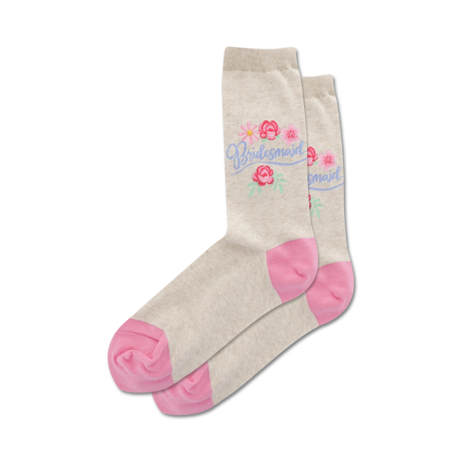 Stride down the aisle in style with these charming Bridesmaid Beige Crew Socks! Wrapped in floral elegance and highlighted with 'Bridesmaid' in delightful blue script, these socks are a perfect blend of comfort and cheer for your special day. Whether you're dancing at the reception or striking a pose for photos, these socks add a pop of fun and a sprinkle of sass to any wedding outfit. So why settle for ordinary when you can celebrate in fabulous floral style? Grab a pair, suit up your bridal squad, and let the good times roll!