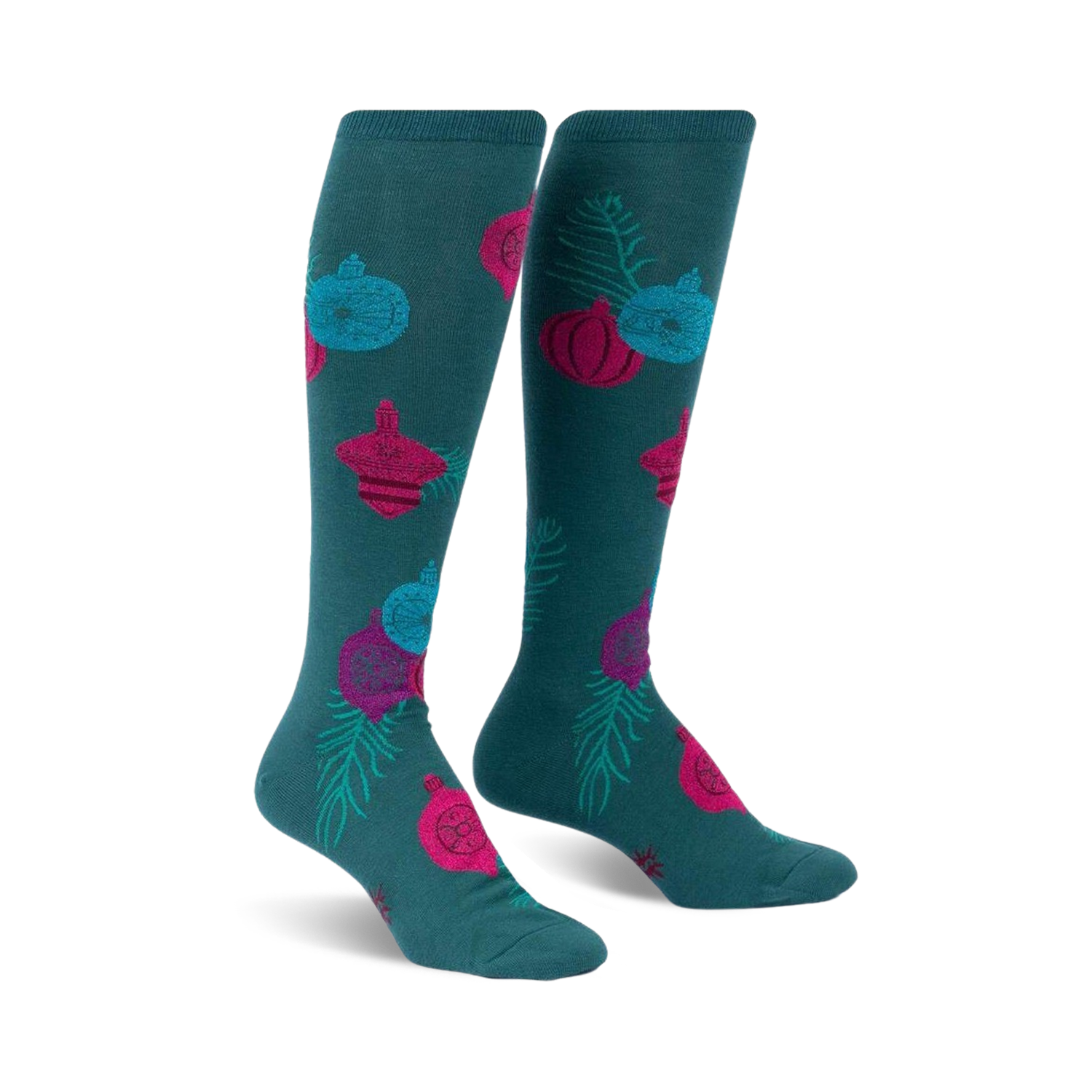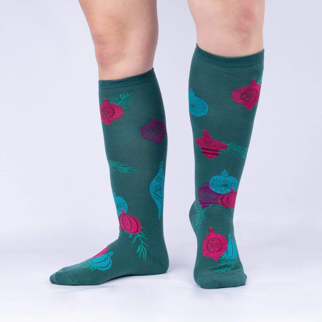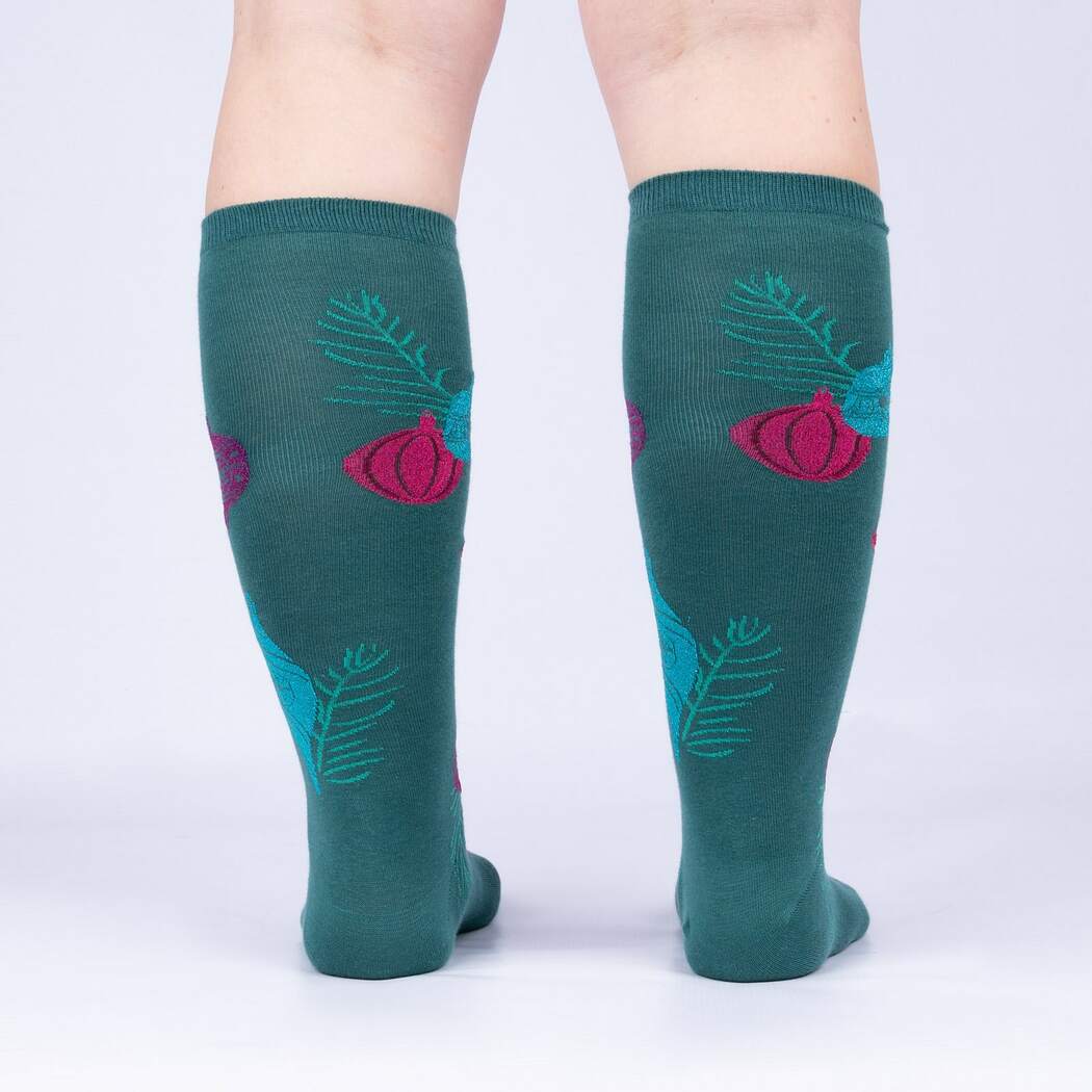 Put on a pair of the knee-high Bring the Bling socks and watch your holiday spirit jump up a few notches. The teal base is covered with variously-colored Christmas ornaments and pine sprigs, giving you an instant burst of festive cheer.